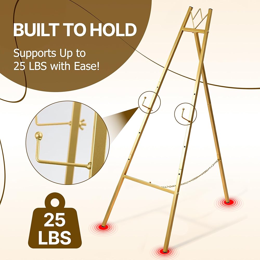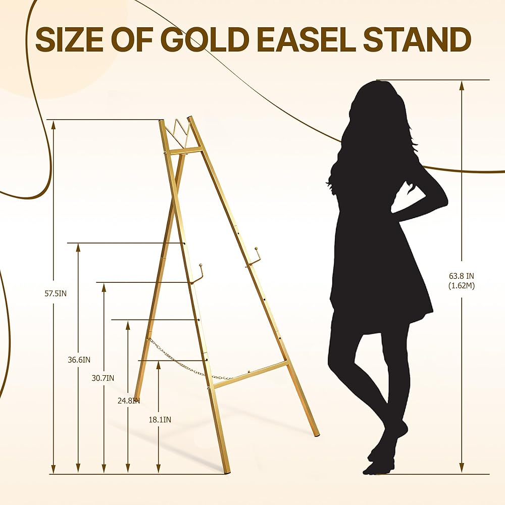 This gold picture stand boasts 4 adjustable height levels (ranging from 36” to 57.5”), allowing it to adapt to various display needs. Use it as a wedding sign stand for tall welcome boards, or adjust it to a lower setting for café menus, art prints, or seasonal décor—no other easel for display offers such flexibility.