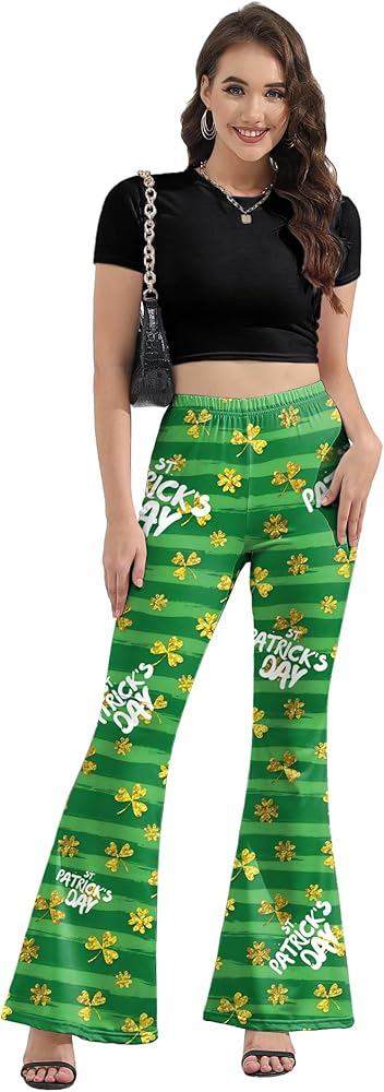 [تعرف على حظ عيد القديس باتريك] - تميز في عروض وحفلات عيد القديس باتريك مع سراويل يوم القديس باتريك النسائية! تمزج هذه السراويل الضيقة ذات الجرس المستوحاة من الطراز القديم للسيدات بين الذوق والسحر الاحتفالي، وتتميز بطبعات البرسيم الجريئة التي تبرز على القماش الأخضر الغني. التصميم عالي الخصر يعانق منحنياتك بينما تخلق الأرجل الواسعة صورة ظلية طويلة للساق - مثالية لتوجيه طاقة الديسكو في احتفالك الأيرلندي القادم!