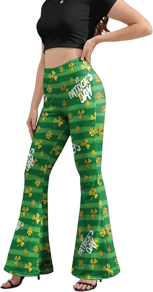 سروال ضيق للسيدات من St Patricks Day Bell Bottoms للنساء، عالي الخصر بالإضافة إلى مقاس St. Patricks Day مطبوع متوهج سروال أخضر للنساء سروال Bell Bottoms ذهبي L