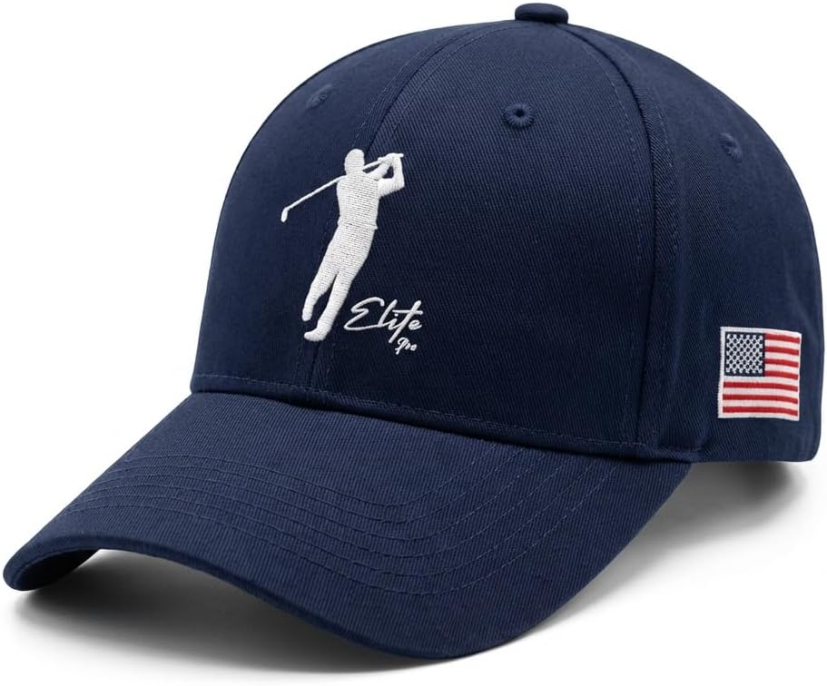 This classic dad hat features a low-profile fit with an embroidered Elite Pro golfer logo on the front and Elite Pro branding embroidered on the back. A subtle USA flag detail on the side adds a refined touch to the overall design.