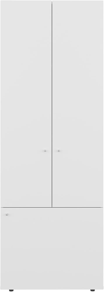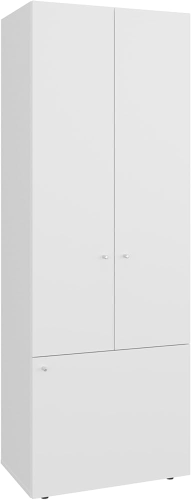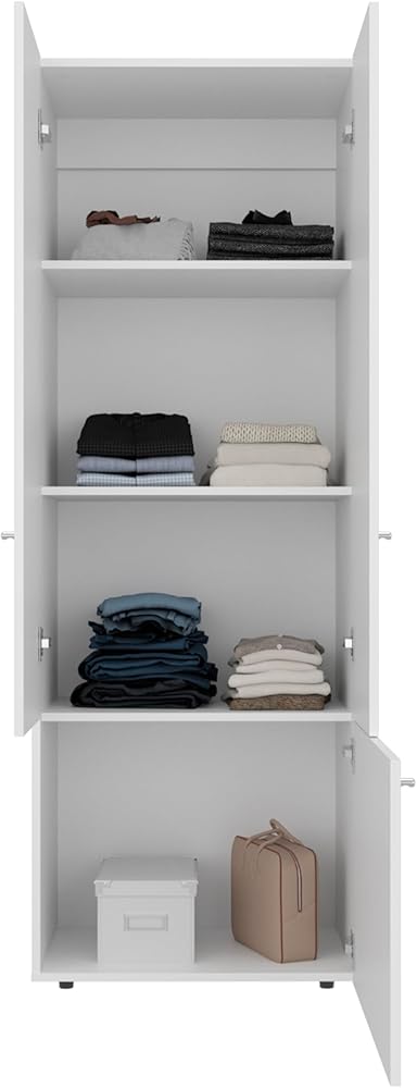 Three-door compact structure offers vertical organization for storing clothing, shoes, and essentials in apartments or small rooms.