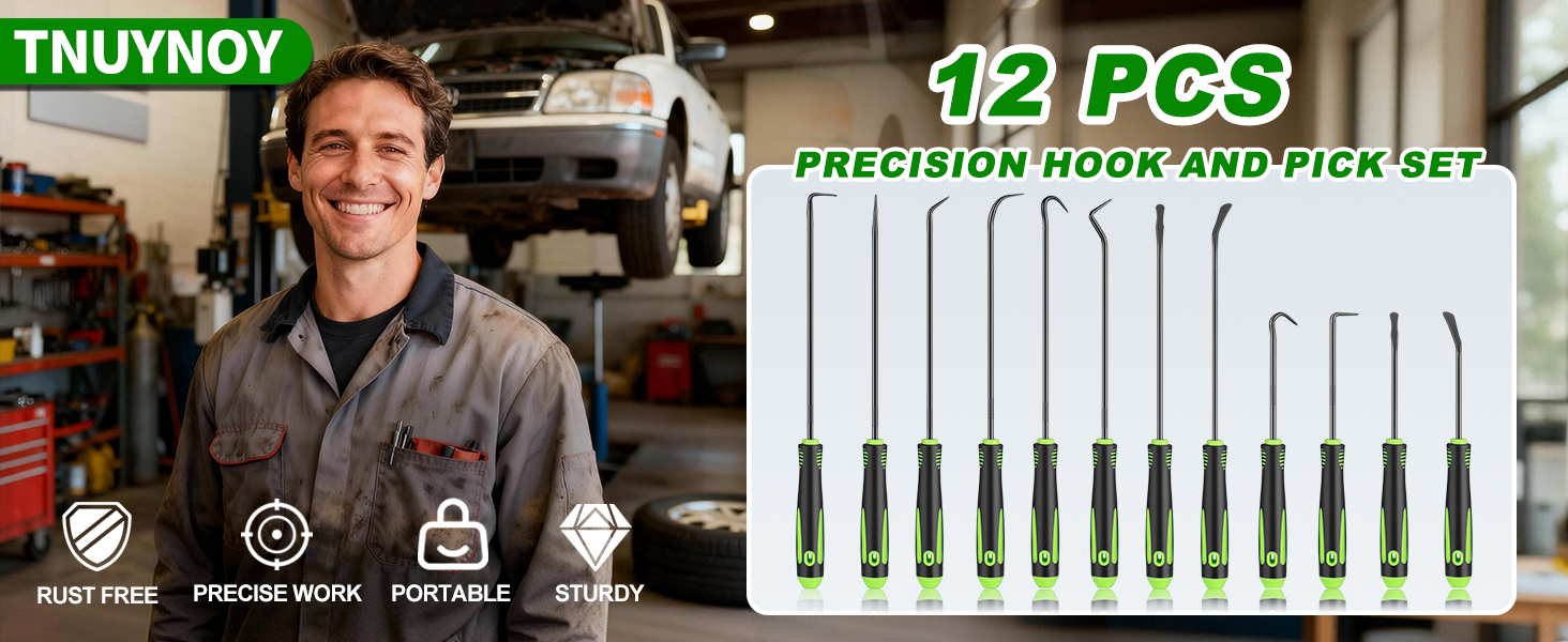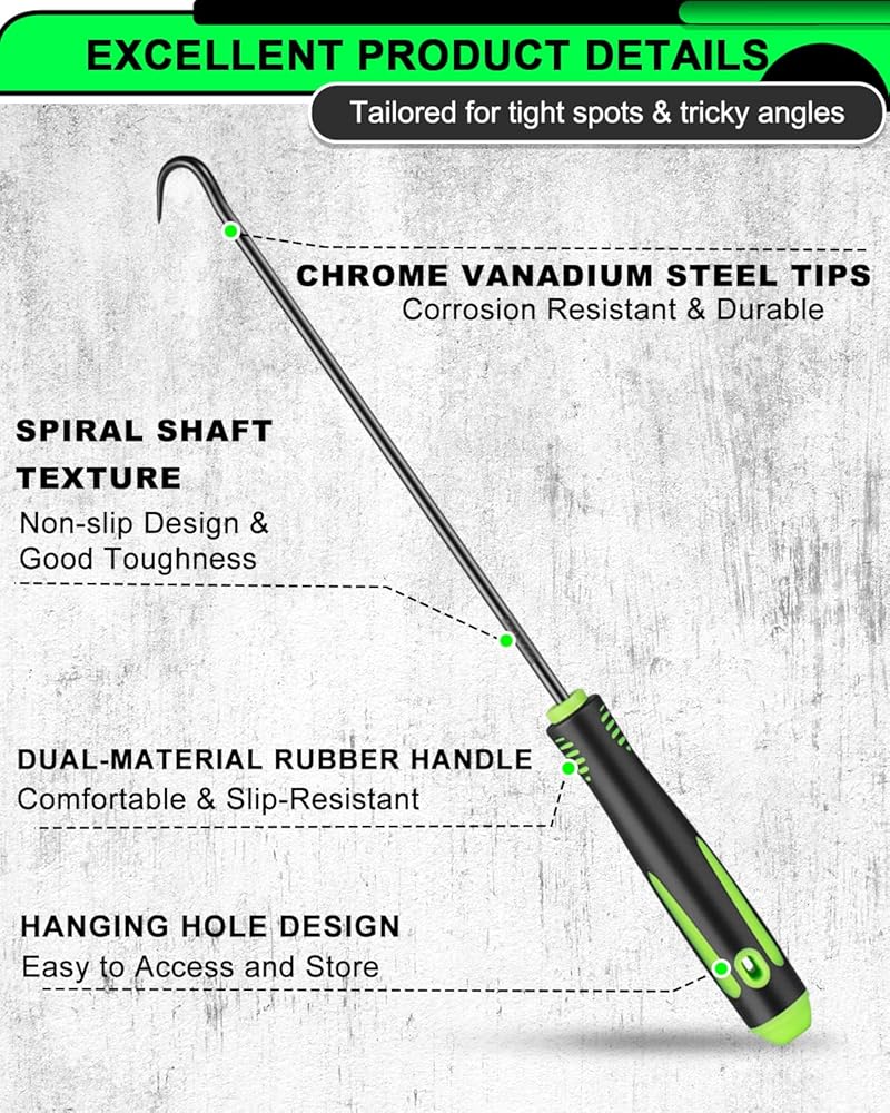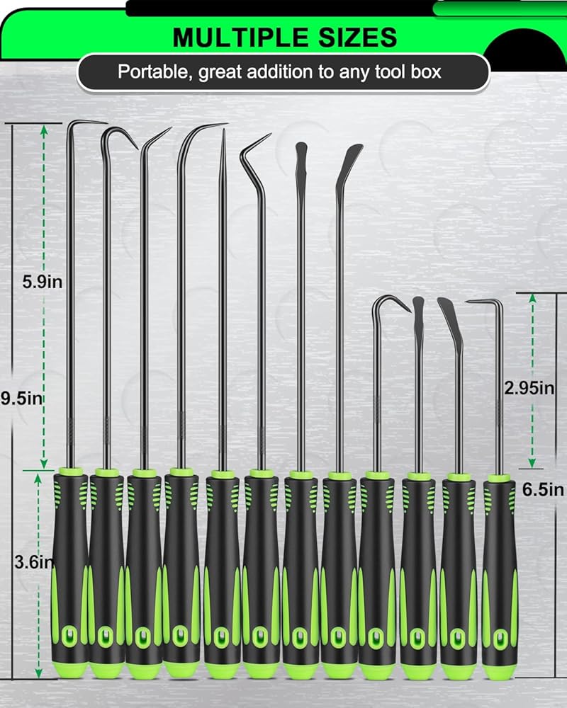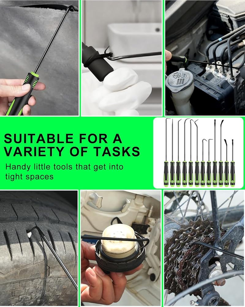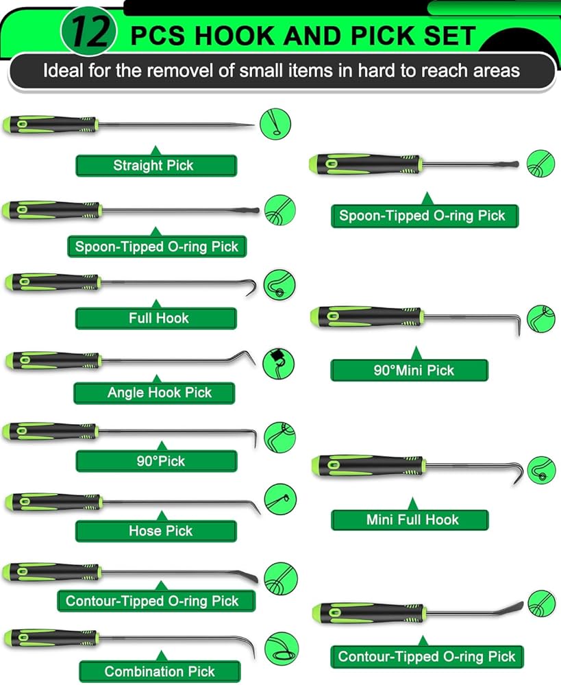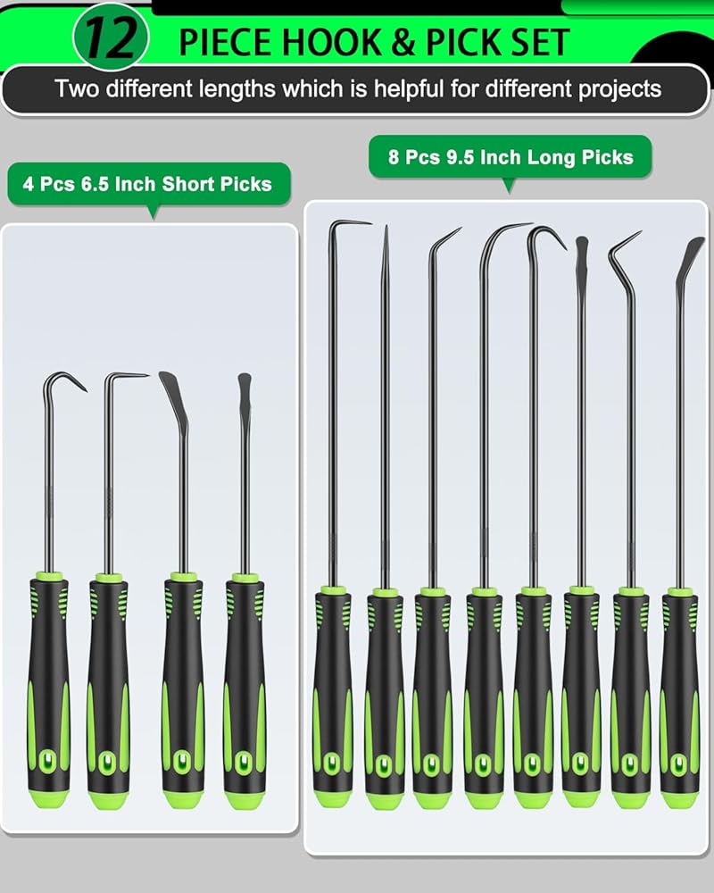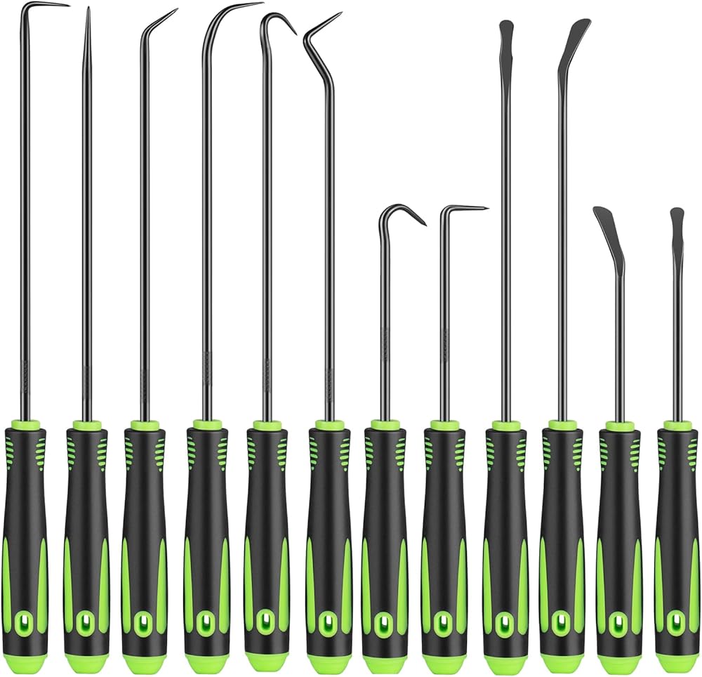 مجموعة أدوات اختيار وخطاف دقيقة مكونة من 12 قطعة، مجموعة أدوات اختيار طويلة وقصيرة لإزالة حشية زيت السيارة/حلقة دائرية، مزيل سحب الخطافات مع قبضة مضادة للانزلاق، مجموعة اختيار ميكانيكي للسيارات