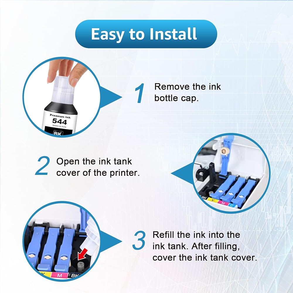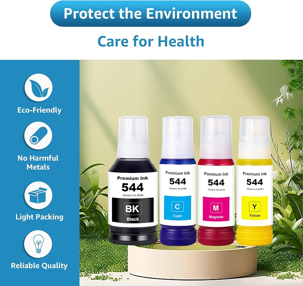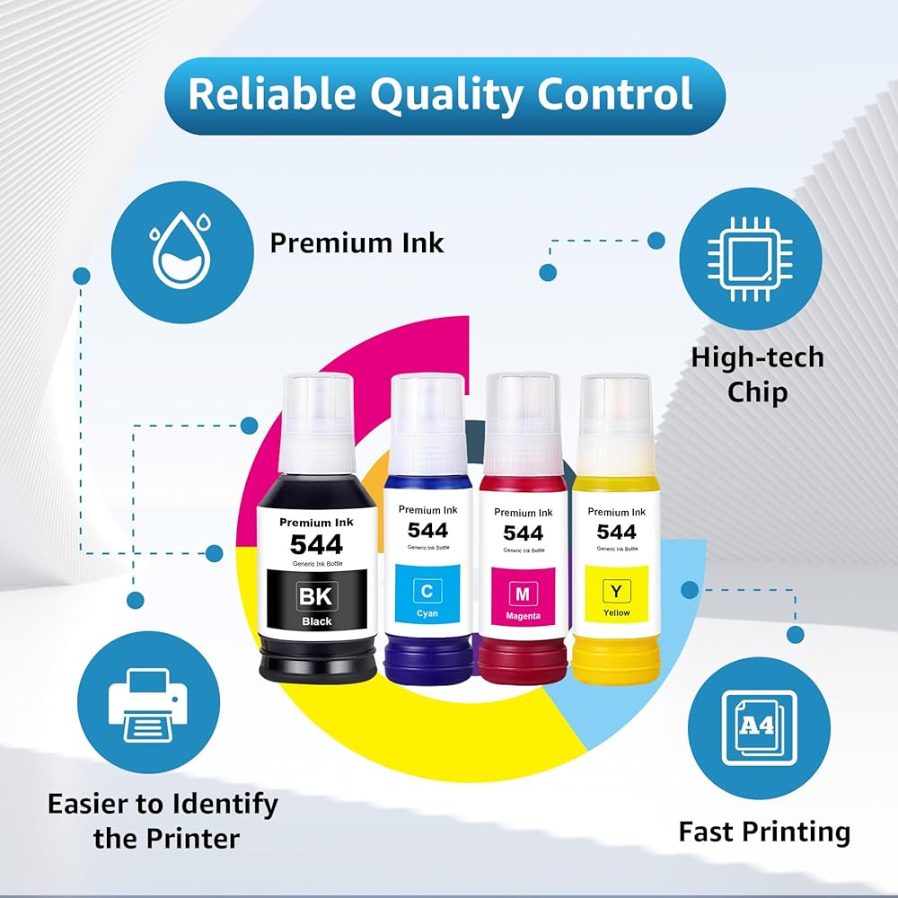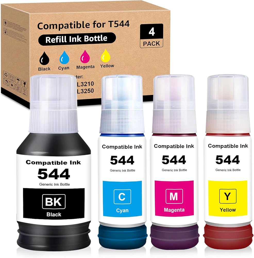 544 زجاجات إعادة تعبئة الحبر 4 عبوات متوافقة مع T544120 T544220 T544320 T544420 بديلة لـ L1210 L1250 L3110 L3150 L3160 L3210 L3250 L3251 L3260 L5290 L5590 (4 عبوات)