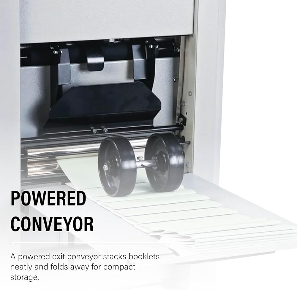 The MBM Sprint 3000 Bookletmaker is a powerful, all-in-one jog, staple, and fold machine designed for efficient, high-speed booklet production. With a user-friendly setup, variable speed control, and the ability to produce up to 1,500 booklets per hour*, the Sprint 3000 is ideal for print shops, in-plant operations, schools, and commercial environments seeking professional-quality results with minimal effort. This versatile booklet maker features two stapling heads and four stapling positions, allowing you to customize staple placement for a wide variety of booklet sizes and styles. It uses standard 210-staple sticks for consistent, reliable performance. The powered exit conveyor neatly organizes finished booklets for easy collection and packaging, while the transparent safety access cover ensures operator safety by preventing operation when the cover is open. Mounted on heavy-duty casters, the Sprint 3000 offers easy mobility and flexibility in any workspace. It can also be interfaced with optional accessories, including the MBM FC 10 collator and face trimmer, to create a seamless, high-volume booklet production system. Whether you're running small batches or large print jobs, the MBM Sprint 3000 delivers fast, professional, and flawless booklet creation—every time.