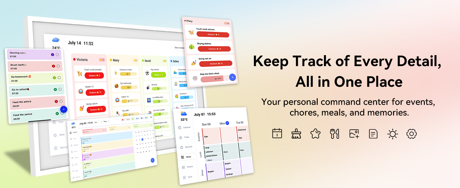 【مركز قيادة العائلة الذكي الكل في واحد】إنهاء الفوضى الورقية والمواعيد المفقودة، يمكنك تنظيم منزلك المزدحم دون عناء على تقويم رقمي مذهل مقاس 15.6 بوصة عالي الدقة. قم بتعيين جداول مرمزة بالألوان، وإدارة المهام باستخدام المكافآت، وتخطيط الوجبات الأسبوعية - كل ذلك من مركز مركزي واحد. وأخيرًا، اجلب الانسجام إلى حياة عائلتك المزدحمة.