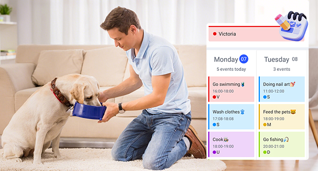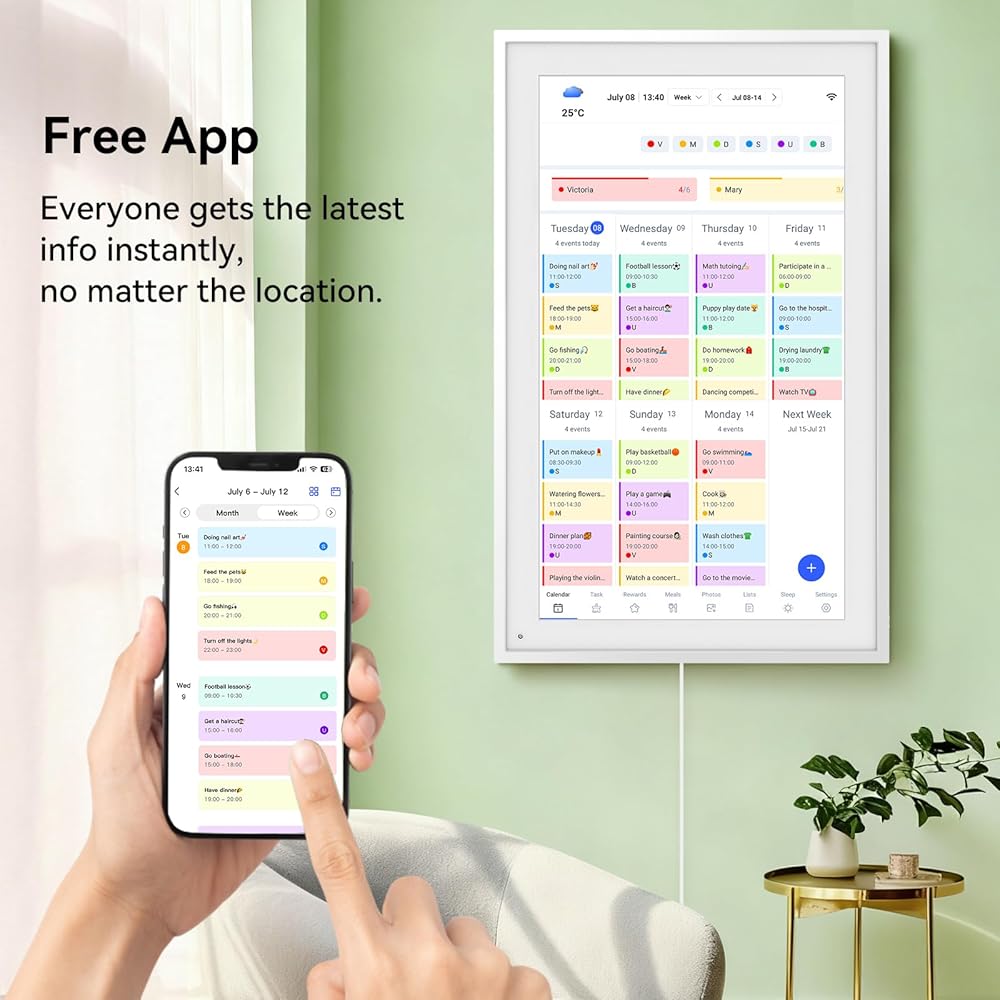 【تحكم في منزلك من أي مكان】ابق على اتصال أثناء التنقل! استخدم التطبيق المصاحب المجاني (iOS/Android) لإضافة أحداث أو تعيين مهام روتينية أو ضبط الوجبات — في أي وقت وفي أي مكان. يظل التقويم الذي يعمل باللمس على الحائط العائلي متزامنًا تمامًا.