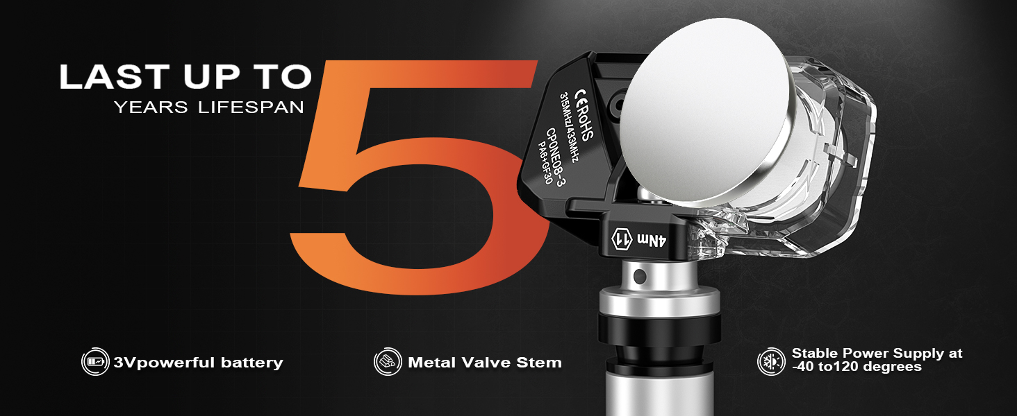 بناء متين ويدوم طويلاً: مصمم لضمان الموثوقية. مزود ببطارية قوية مصممة لتدوم لأكثر من 5 سنوات في ظل ظروف القيادة العادية، يتحمل مستشعر ضغط الإطارات درجات الحرارة القصوى من -40 درجة مئوية إلى 120 درجة مئوية (-104 درجة فهرنهايت إلى 248 درجة فهرنهايت). يضمن تركيبه المتين أداءً ثابتًا خلال الطقس القاسي والحفر والطرق الوعرة، مما يوفر راحة حقيقية "اضبطه وانسى الأمر".