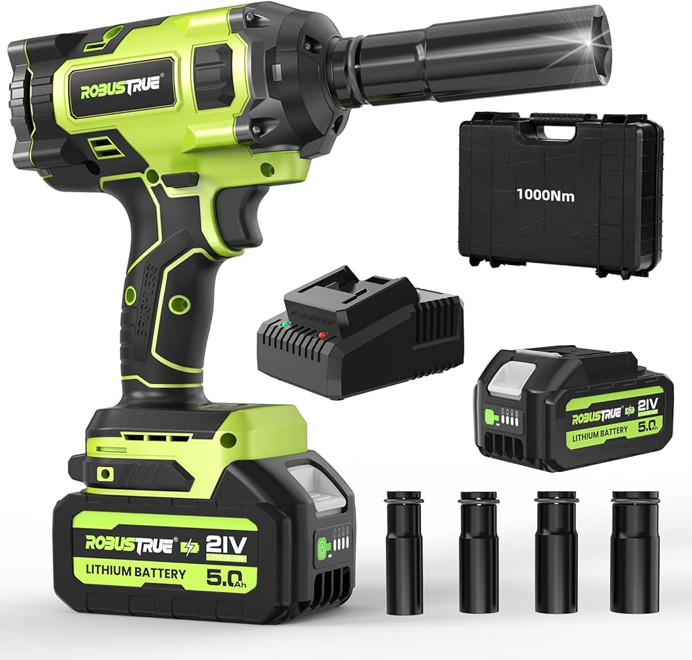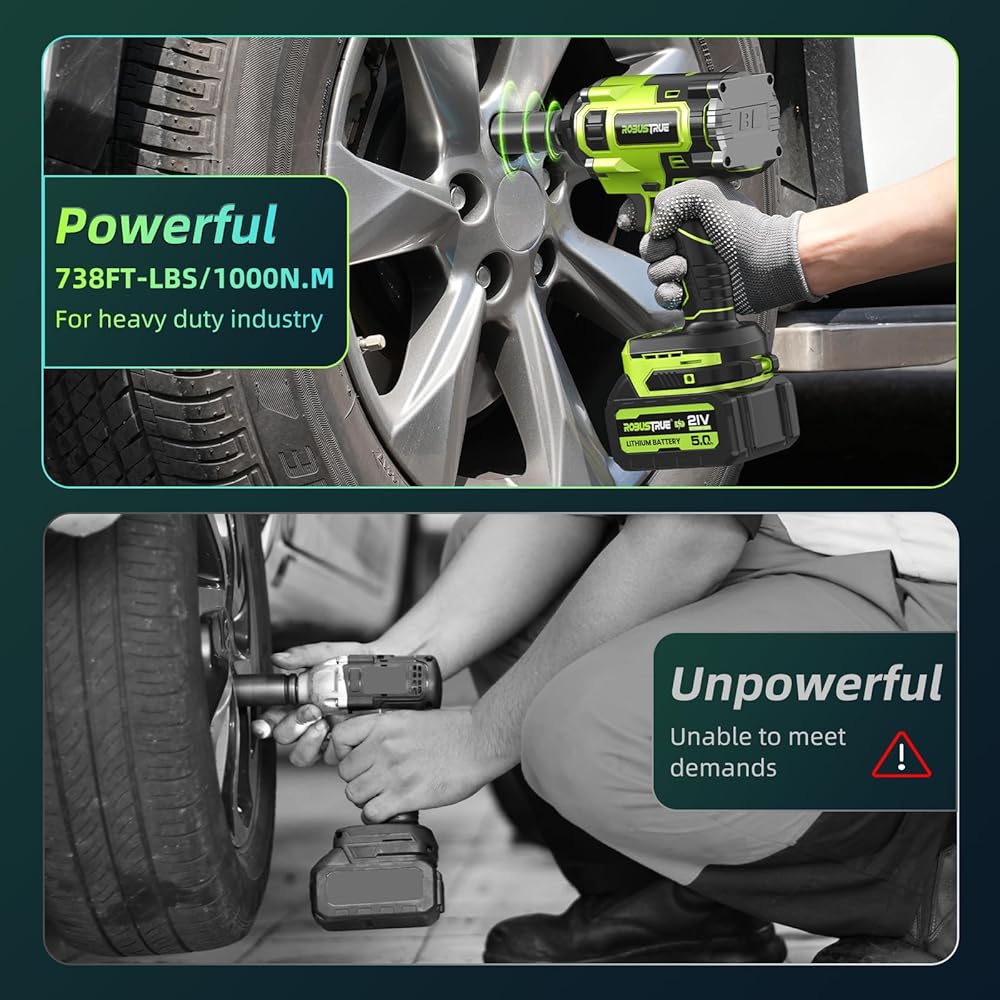 1000N.m High Torque & Upgraded Brushless Motor Compared with brushed motors, brushless motor have strength in better performance and longer durability, with less noise and no sparks. Impact wrench with a torque up to 1000N.m and max 2600RPM speed, the strong torque is equivalent to 10 adults exerting force at the same time, 1/2 impact wrench effortlessly handle the automotive repairs, construction projects, or DIY tasks, break off the truck tires/rusty nuts/ bolts/scaffolding in seconds.