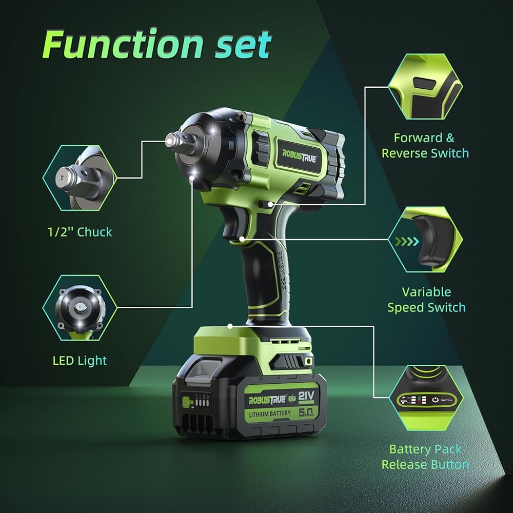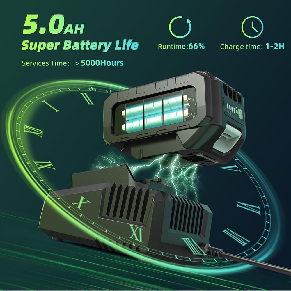 5.0Ah Li-on Battery & 1-2H Quick Charge The battery powered impact wrench is equipped with 5.0Ah batteries and passed a rigorous 1000 charging cycle test, ensuring its durability and longevity. Compared with other 4.0Ah batteries, it can extend more than 50% of working time. A fast charger greatly reduces the charging time of the 5.0Ah battery and speeds up your work efficiency.