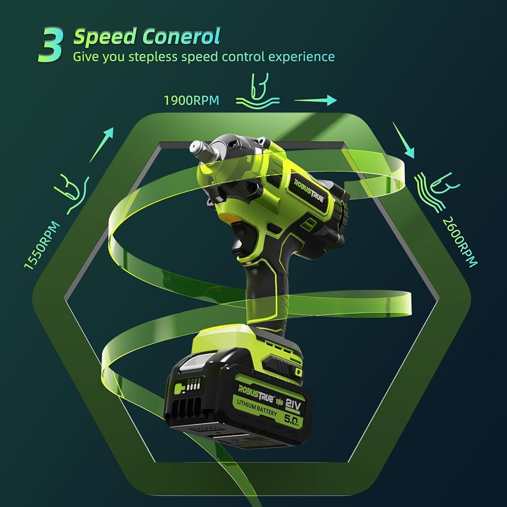 3 Adjustable Speed Control Equipped with 3 speed from 0-2600 RPM, the speed is easily controlled with a single button to meet various working demands. The forward/backward switch of the cordless impact wrench, allowing you to quickly switch working status, and tighten or replace/remove nuts. When reverse rotation, push the switch button can trigger Brake Stop function, no need to worry about your nuts/bolts falling or damage after loosening.