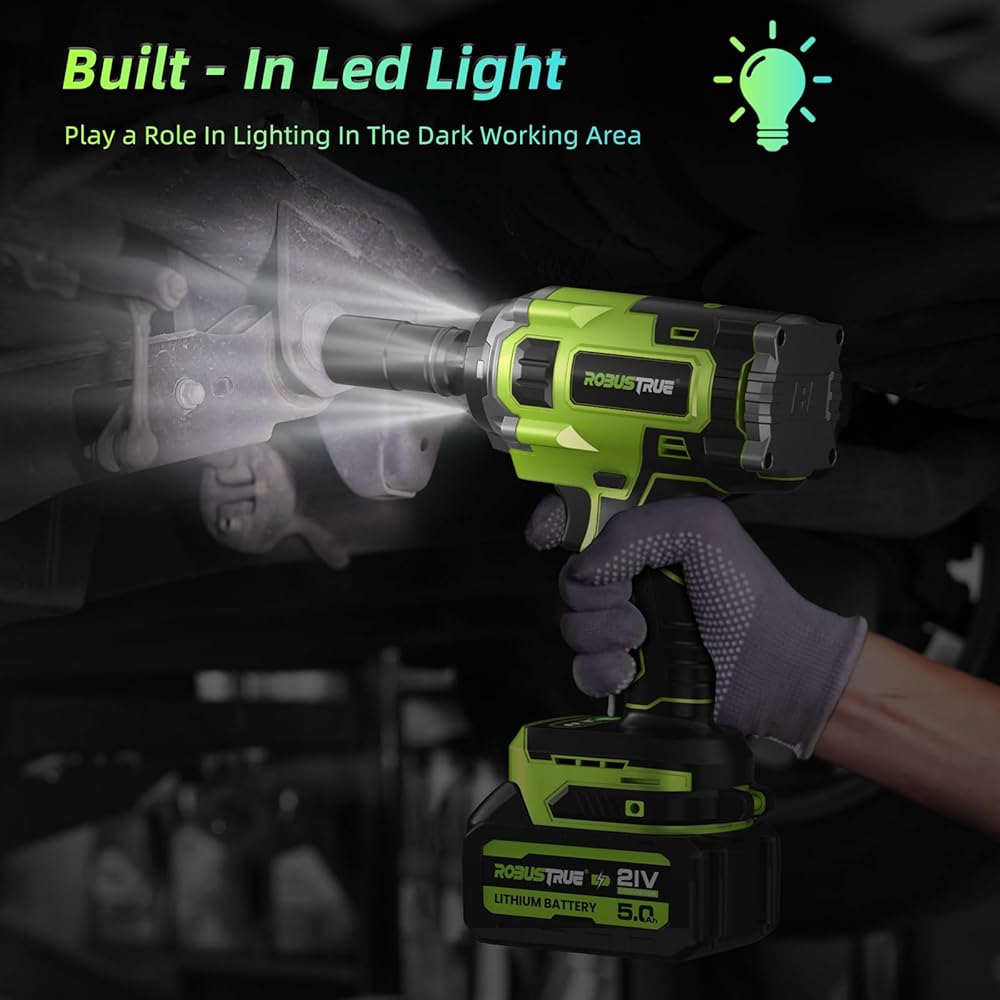 Brighter LED Light & Comfortable Grip Soft grip handle added comfort and will make you feel no obvious numbness in the hand when vibrating, reduces muscle soreness after long hours of work.Electric impact wrench built-in LED light help you work in dark places.It will stay on for approximately 20 seconds after releasing the trigger of the battery power impact wrench, greatly increases visibility in dark environments.