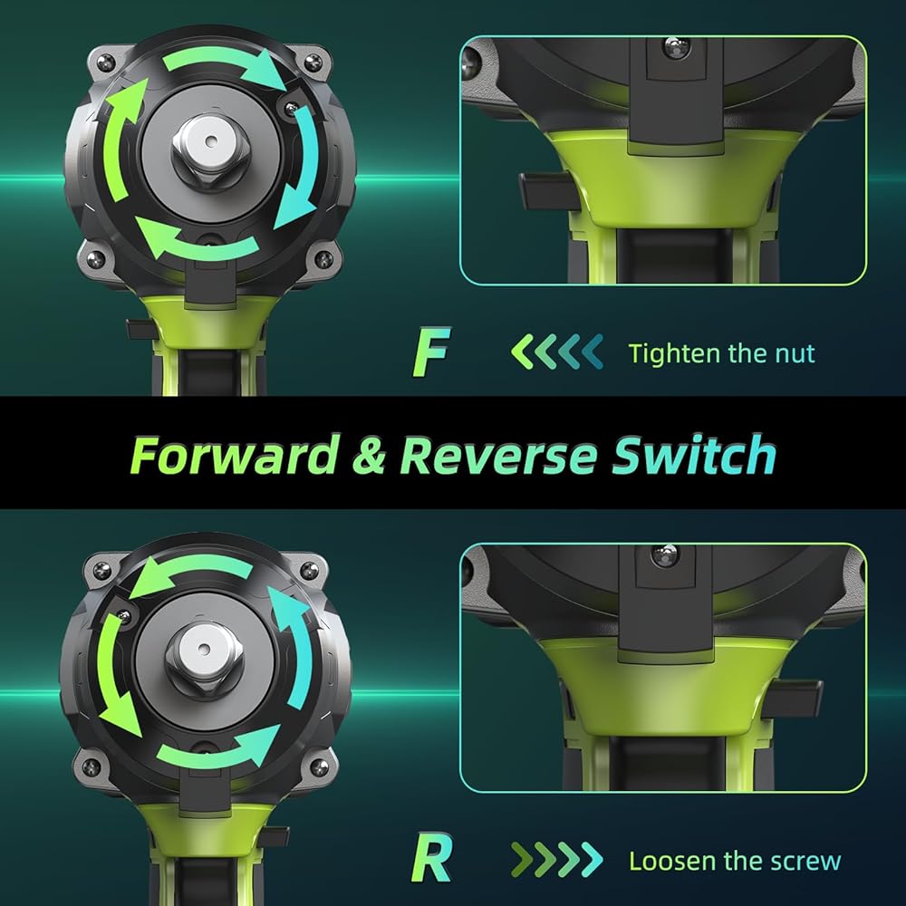Two Directions and Reverse Auto-Stop Mode This cordless impact wrench 1/2 with forward and reverse mode. In reverse mode, once the nut or bolt is loosened, the brake stop device will activate and reduce speed and torque to prevents the nut from falling off and protecting the bolt thread..Compact and Lightweight The compact electric impact gun head design makes it easier to access tight places, for indoor and outdoor use.