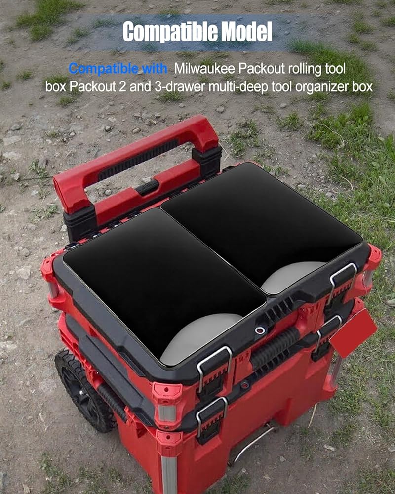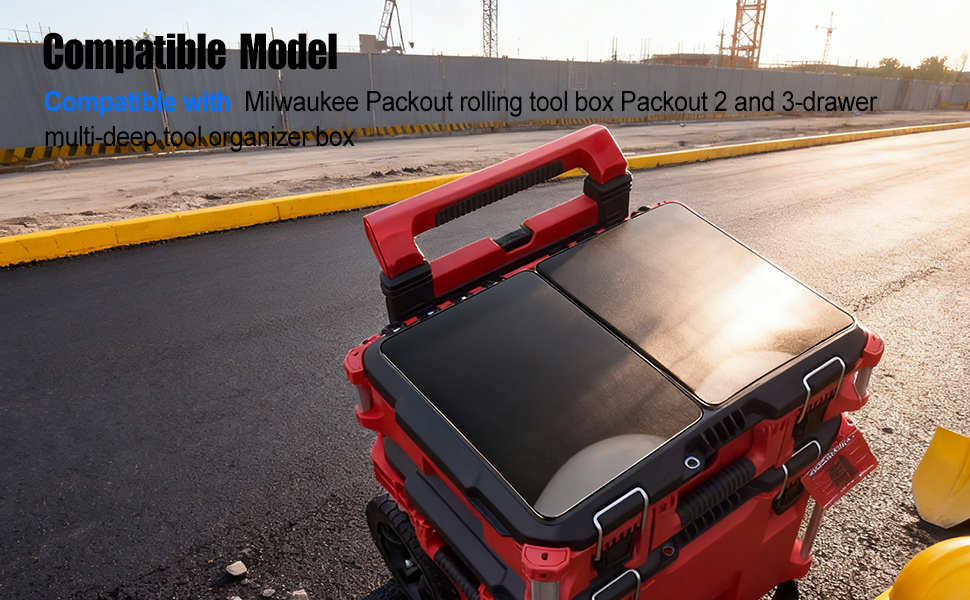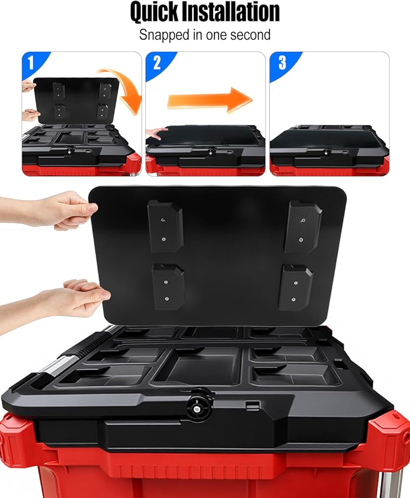 متوافقة مع Milwaukee Packout: لوحة طاولات Toolbox متوافقة فقط مع أنظمة Milwaukee Packout، مثل صناديق الأدوات الدوارة وخزائن 2/3 أدراج، وتوفر منصة عمل مسطحة ومستقرة وسلسة لأعلى صندوق الأدوات، مما يسمح بالكتابة والرسم والقياس في أي وقت، والترقية إلى محطة العمل المتنقلة