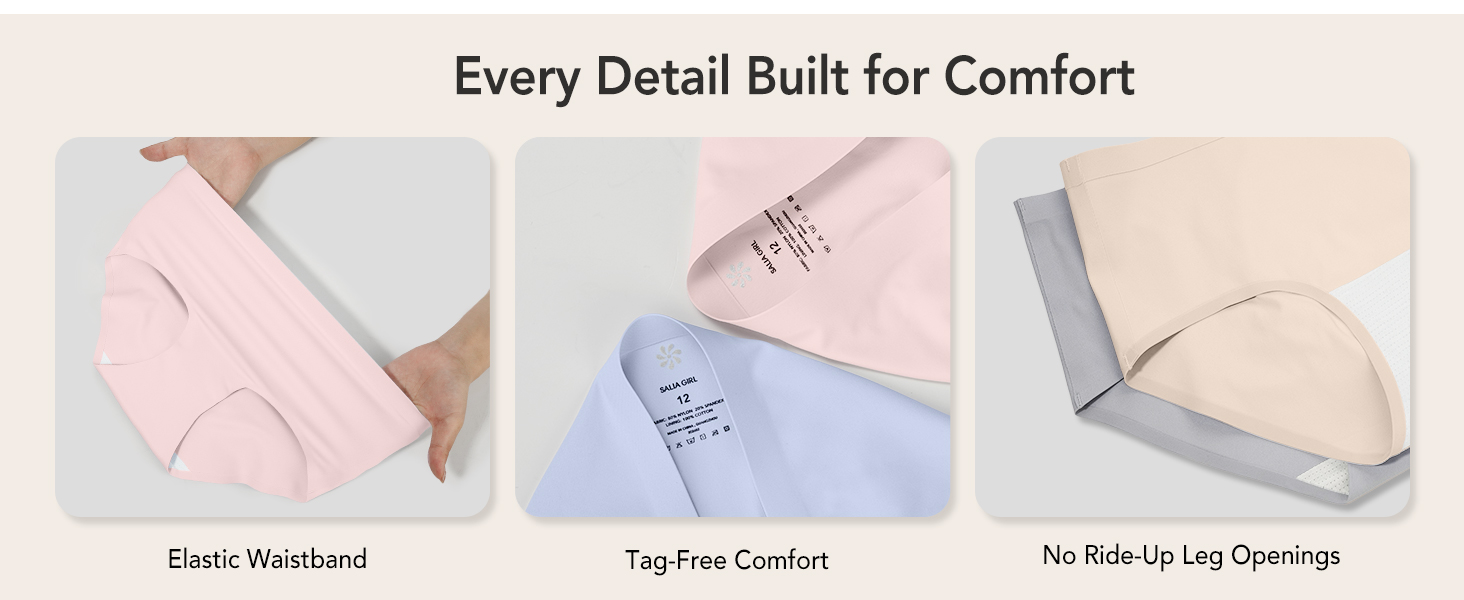 فتحات حزام الخصر والساق: تتميز بحواف مرنة مربوطة مقاس 6 مم عند حزام الخصر وفتحات الساق من أجل ملاءمة ناعمة غير قابلة للالتفاف ولن تحفر أو تترك علامات. مصممة للبقاء في مكانها دون الركوب، توفر هذه الملابس الداخلية للفتيات التي لا تظهر دعمًا خفيفًا ومريحًا للارتداء طوال اليوم.