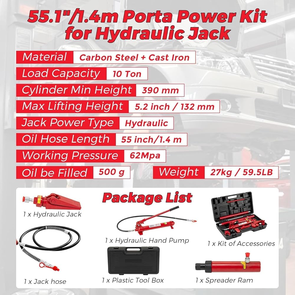 Versatile enough to handle a full spectrum of tasks—lifting, pulling, pushing, bending, or straightening—the kit is suited for frame work, construction, farming, and industrial repairs. Multiple extension pipes, spreaders, and connectors let you adjust for virtually any application.