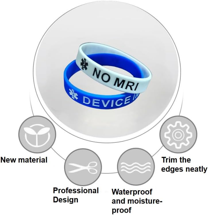 • CLEAR “NO MRI DEVICE IMPLANT” MESSAGE – Each wristband is clearly engraved with “NO MRI DEVICE IMPLANT” to alert medical staff instantly in case of emergency. Ideal for people with implants, pacemakers, or medical devices incompatible with MRI machines.