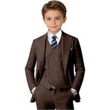 • Boys Tweed 5 Piece Suit Set: This boys herringbone tweed suit includes a tweed suit jacket, a double breasted vest, a tweed suit pants, a dress shirt and a tie. Choose kids suit size 2T, 3T, 4T, 5, 6; boy suit size 7, 8, 10, 12, 14, 16; teen boy suit size 18-20.