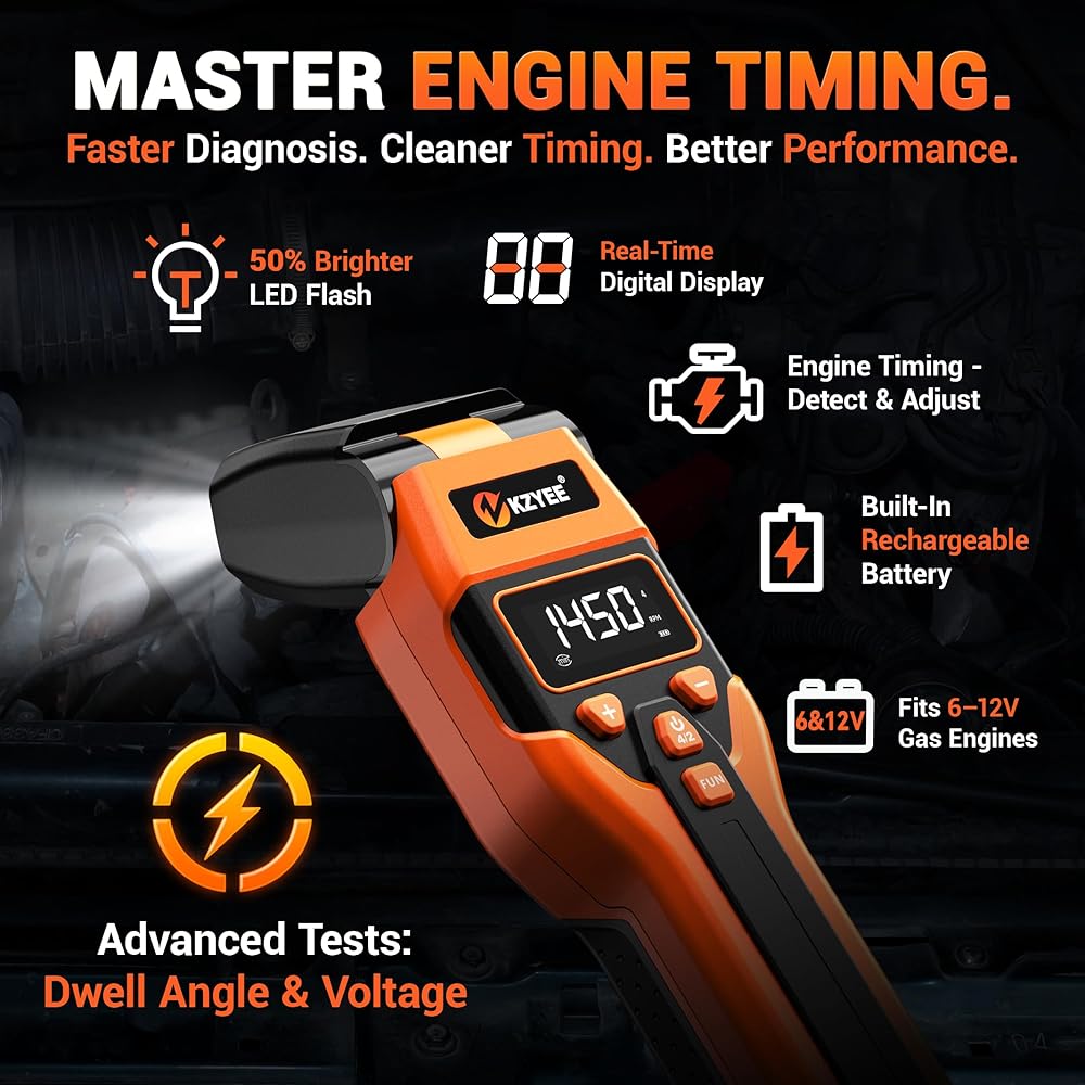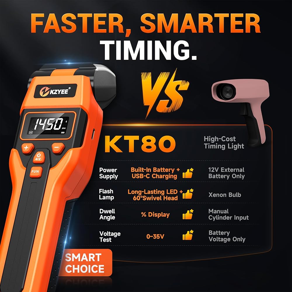 🚀【 Upgraded Multi-Function Timing Light for Tuning 】The KT80 goes beyond basic timing lights with three essential ignition tests—Timing, Dwell, and a true 0–35V Voltage range—plus an upgraded LED strobe with up to 10× longer service life and a 60° adjustable head for precise alignment. Supports 6V/12V gasoline engines and offers flexible power for classic tuning and restoration work.