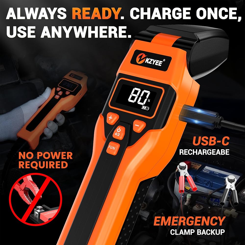 【 Dual-Power Design – Internal Battery + 12V Runtime】Unlike timing lights that rely only on battery clips, the KT80 features a rechargeable internal lithium battery for independent testing, with 12V battery clips as backup for extended sessions. USB-C fast charging keeps you working without interruption. ⚡ Backup clips require a 12V battery.
