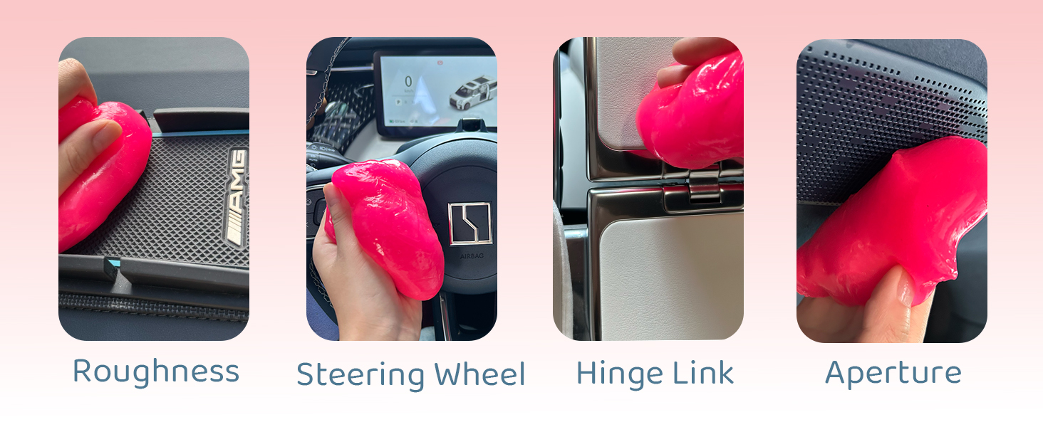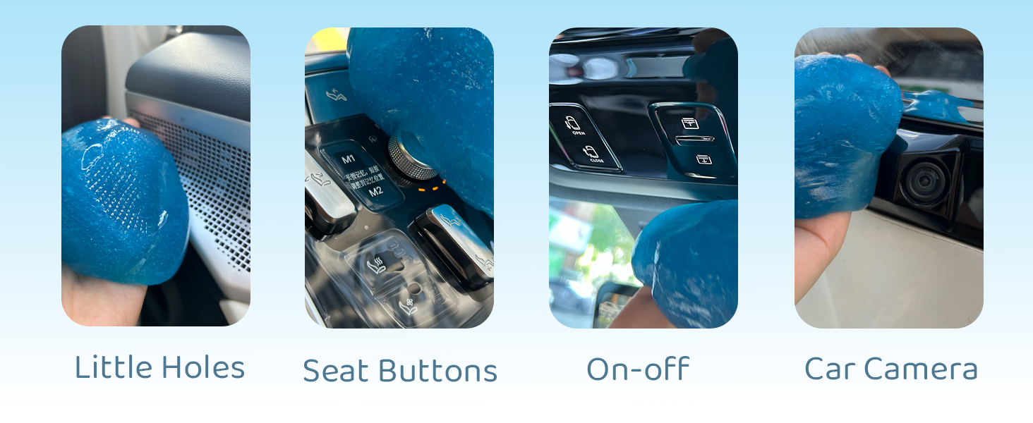 تنظيف متعدد الأغراض: لا يمكن استخدامه فقط للغبار الموجود في زوايا السيارة، ولكن أيضًا لتنظيف الضروريات اليومية مثل الغبار الموجود على سطح المكتب، والغبار الموجود في فجوات لوحة المفاتيح، والغبار الموجود على جهاز التحكم عن بعد؛ يجب الحرص على عدم شطف جل تنظيف السيارة بالماء؛ يمكن تخزينه في علبة ويمكن استخدامه بشكل متكرر