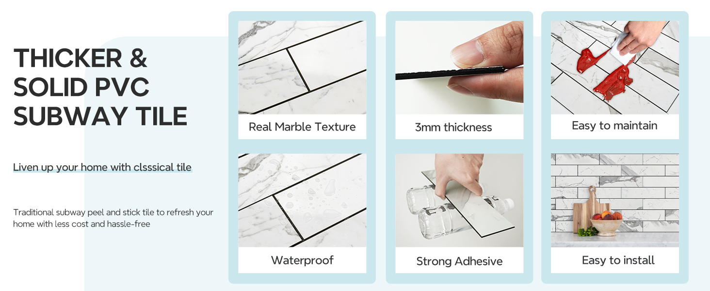 صديقة للبيئة: فقط قم بتقشيرها وتشابكها ولصقها، سهلة القطع بسكين حاد ثم قم بإطباقها. لا فوضى، وفر وقتك ووفر تكاليف المقاول. بلاط مترو الأنفاق الفردي مقاس 3 × 12 بوصة يخطط للتخطيط بحرية حسب خيالك، اختيارات مثالية لـ DIY'ER.