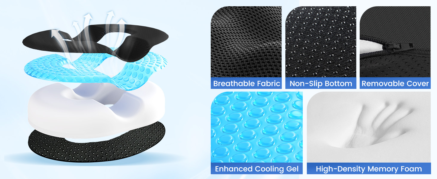 ملاءمة ثابتة لأي مقعد: تتميز وسادة مقعد الكرسي بقاعدة غير قابلة للانزلاق، مما يضمن بقاءها ثابتة في مكانها على كراسي الطعام وكراسي المكتب ومقاعد السيارة والكراسي المتحركة. تساعدك وسادة الدونات المخصصة للبواسير على الجلوس بثقة وراحة دون أن تتحرك الوسادة بشكل مستمر