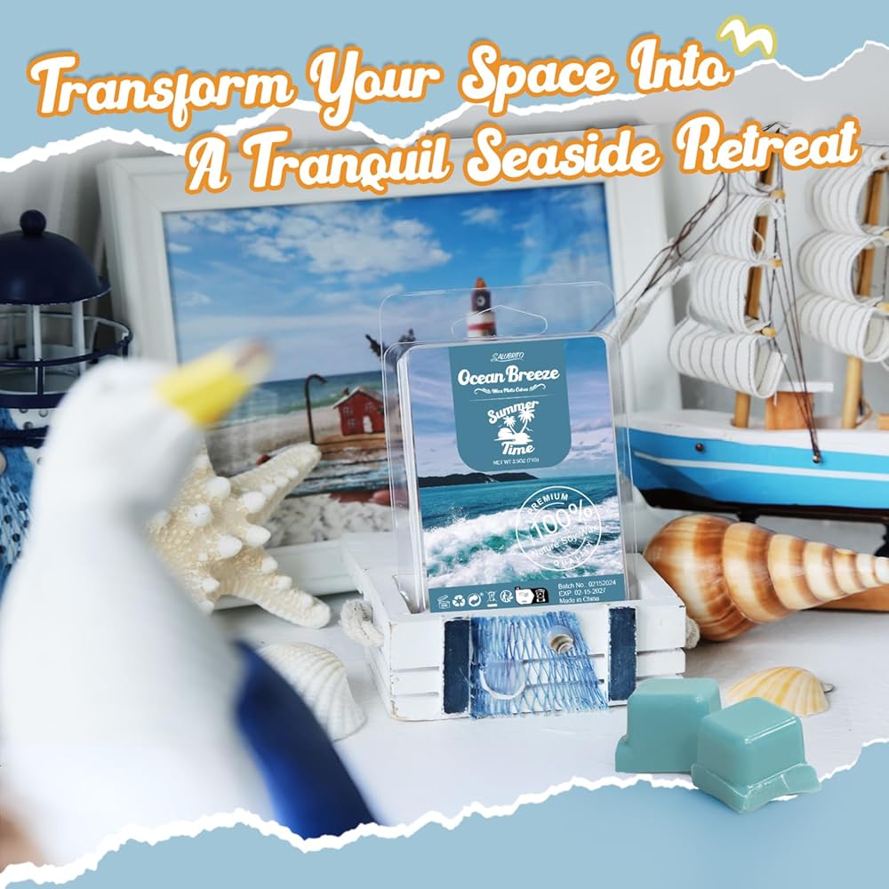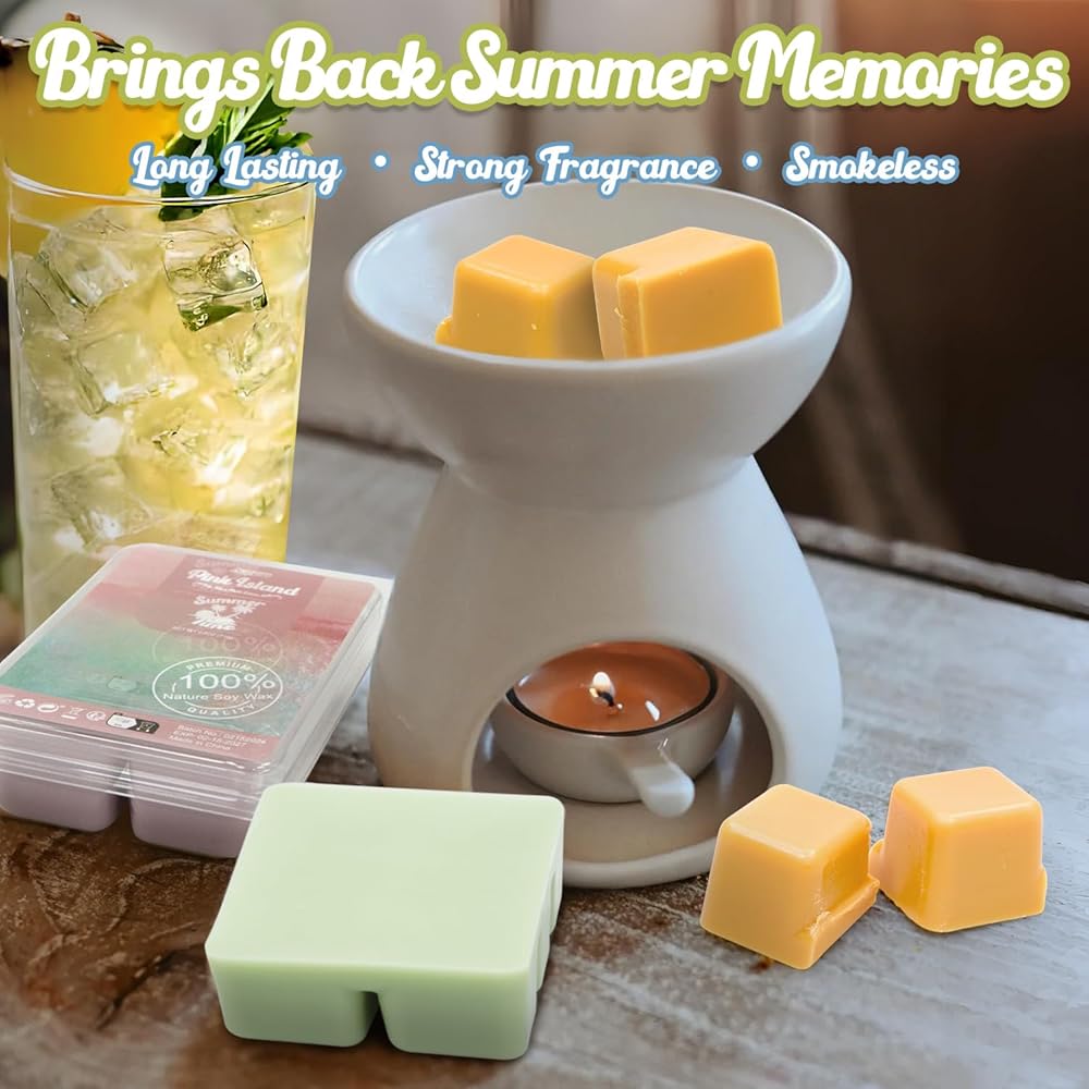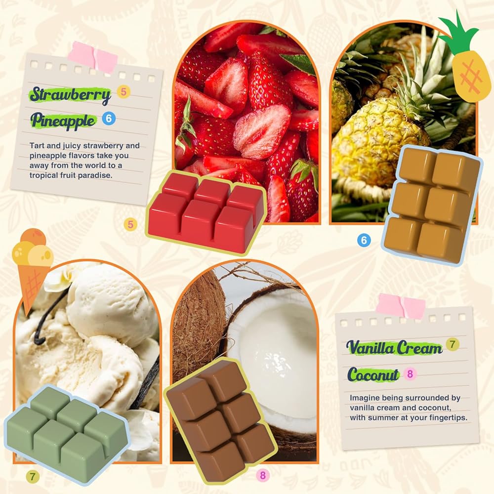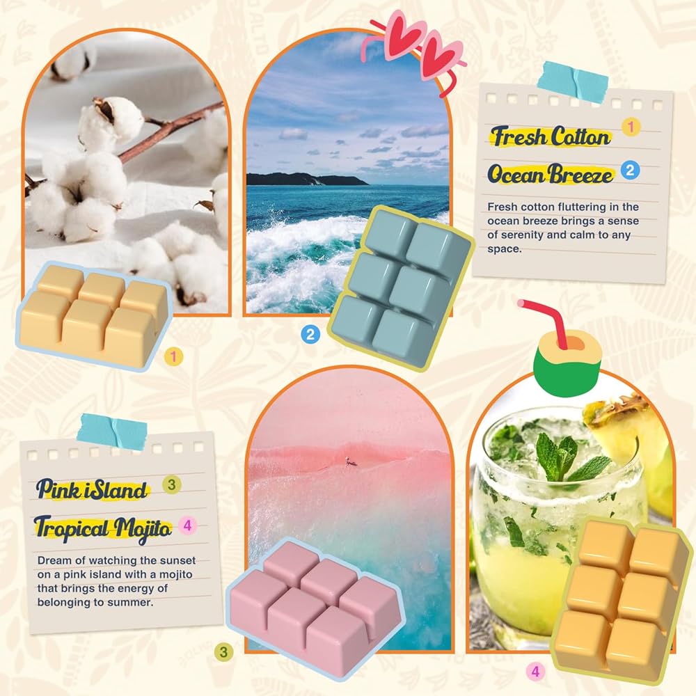 • استمتع بعطر الصيف المنشط: قم بتحويل مساحتك إلى ملاذ هادئ على شاطئ البحر مع ذوبان الشمع الصيفي. القطن المنعش، نسيم المحيط، الموهيتو، الجزيرة الوردية، جوز الهند، الأناناس، كريمة الفانيليا، مكعبات الشمع بالفراولة ستجعلك تشعر وكأنك تستلقي على شاطئ مشمس، وتستمتع بدفء الشمس أينما كنت