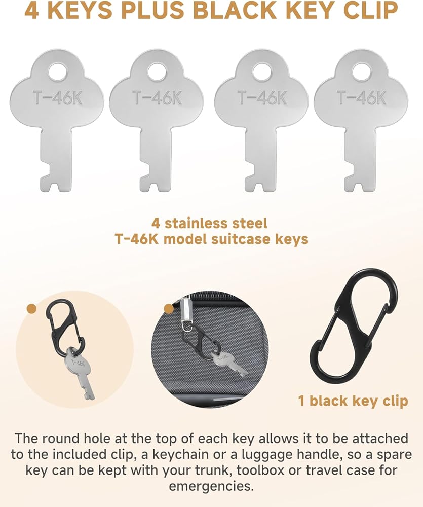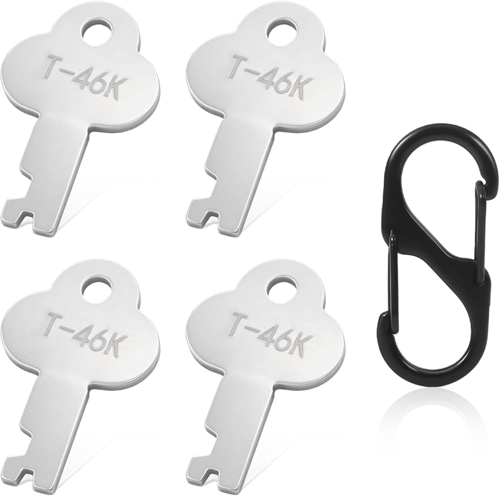 【4 Keys Plus Black Key Clip】Each set includes four stainless steel T-46K style trunk keys and one black key holder clip. The round hole at the top of each key allows it to be attached to the included clip, a keychain or a luggage handle, so a spare key can be kept with your trunk, toolbox or travel case for emergencies