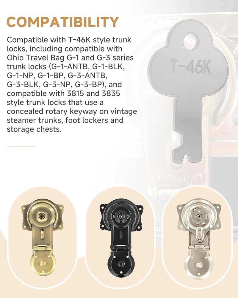 【Compatibility】Compatible with T-46K style trunk locks, including compatible with Ohio Travel Bag G-1 and G-3 series trunk locks (G-1-ANTB, G-1-BLK, G-1-NP, G-1-BP, G-3-ANTB, G-3-BLK, G-3-NP, G-3-BP), and compatible with 3815 and 3835 style trunk locks that use a concealed rotary keyway on vintage steamer trunks, foot lockers and storage chests