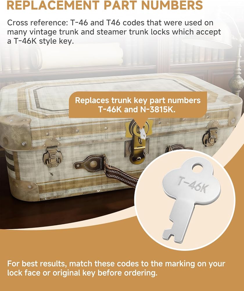 【Replacement Part Numbers】Replaces trunk key part numbers T-46K and N-3815K. Cross reference: T-46 and T46 codes that were used on many vintage trunk and steamer trunk locks which accept a T-46K style key. For best results, match these codes to the marking on your lock face or original key before ordering