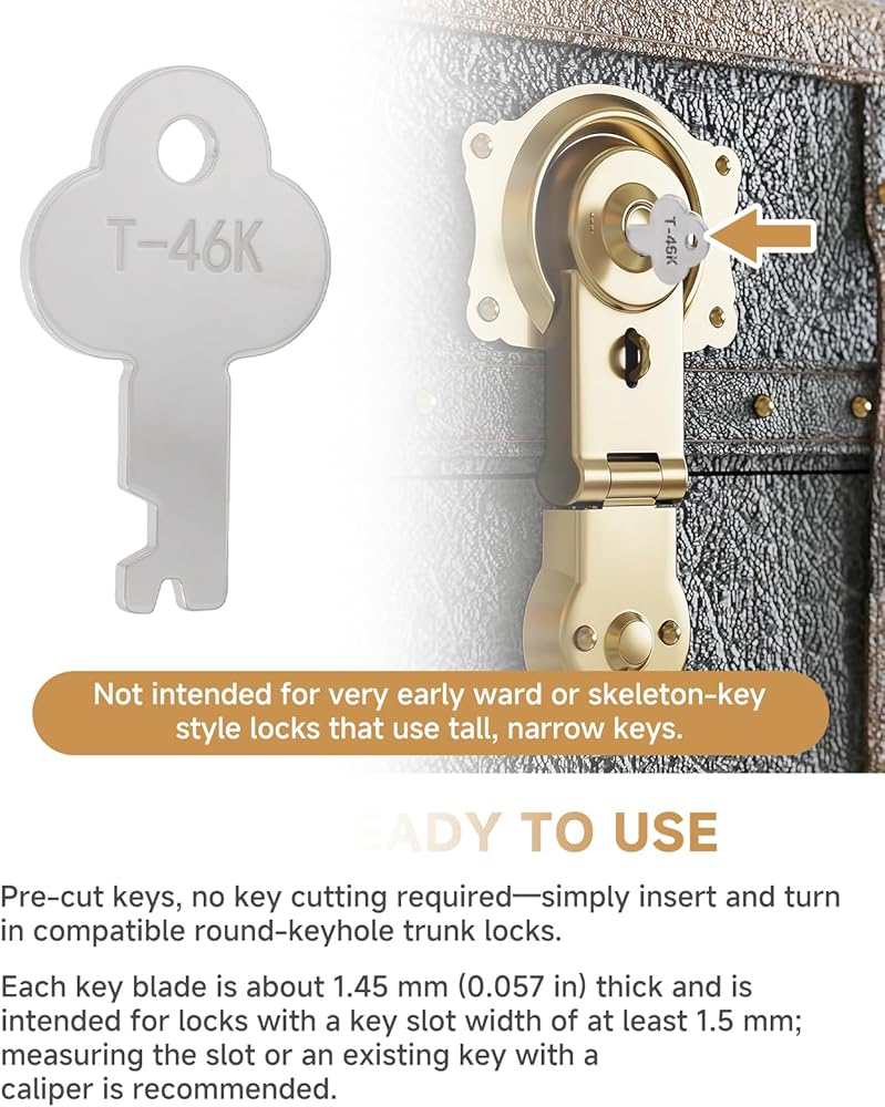 【Pre-Cut & Ready to Use】Pre-cut keys, no key cutting required—simply insert and turn in compatible round-keyhole trunk locks. Each key blade is about 1.45 mm (0.057 in) thick and is intended for locks with a key slot width of at least 1.5 mm; measuring the slot or an existing key with a caliper is recommended. Not intended for very early ward or skeleton-key style locks that use tall, narrow keys