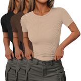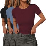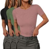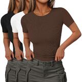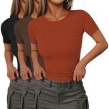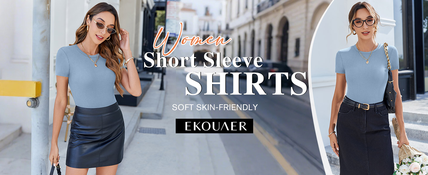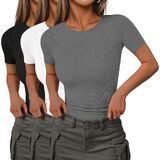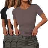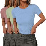 Ekouaer قمصان نسائية قصيرة الأكمام خفيفة الوزن أساسية ملابس مضلعة متماسكة تي شيرت برقبة دائرية تي شيرت بلوزة للعمل in Kuwait