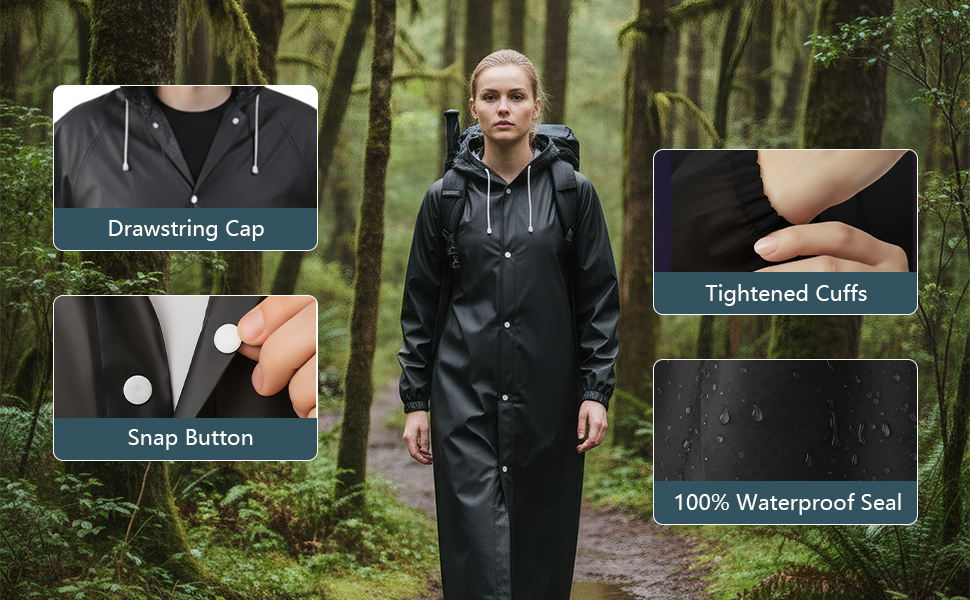 💧 Full Waterproof Protection - Features a quick-drying design with a adjustable drawstring hood to provide comprehensive coverage, keeping you completely dry even in heavy rain conditions.