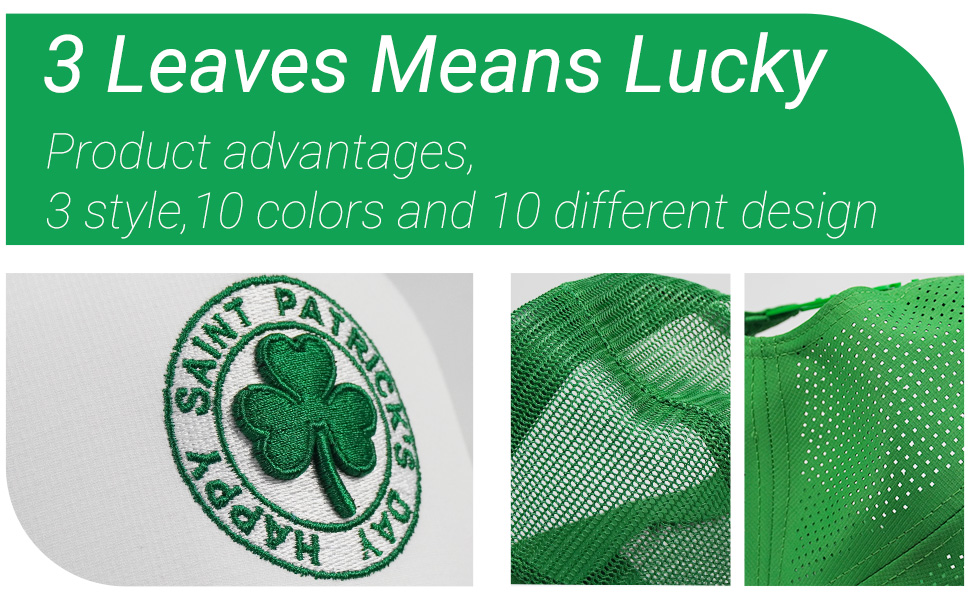 • This St Patricks Day Hat captures Irish charm with a 3D clover logo and "Lucky" embroidery, perfect for celebrating the holiday with pride. This Saint Patricks Day Lucky Hat made of 100% high-quality polyester, This St Pattys Shamrock Trucker Hat for Men and Women is lightweight breathable and wear-resistant, suitable for outdoor parades camping and daily wear