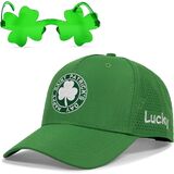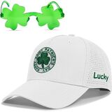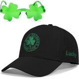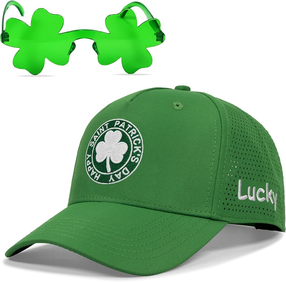 This lucky clover St Patricks Day hat includes 1 cap and 1 sunglasses in a gift box, a nice saint patty's day accessories or gift. It fits head circumferences 56-60cm with an adjustable buckle. The 100% polyester material is breathable and durable hand wash cold and air dry. It's designed for St Patricks Day events outdoor activities and daily wear combining festive charm and practicality. This laser-cut back design blends functionality and elegance. It maintains the hat's shape better than mesh, while still providing great ventilation. Whether you're at a parade or running errands, it keeps you cool and complements the clover embroidery's festive charm