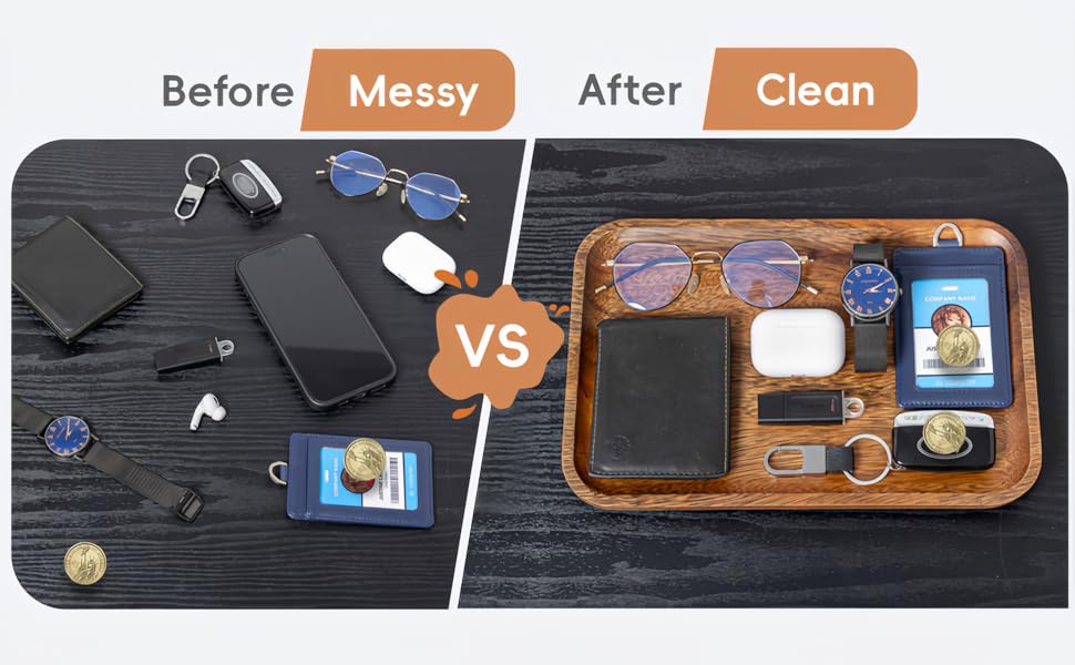 استخدم صينية تخزين خشب السنط الخاصة بنا، وسوف تحصل على صينية نظيفة وبسيطة للحفاظ على الطلب الذي تحتاجه، وترتيب ضرورياتك اليومية دون عناء.