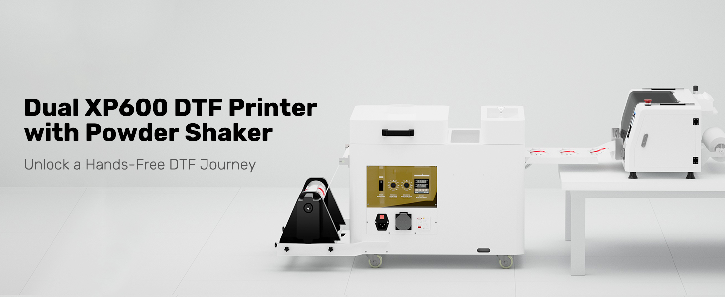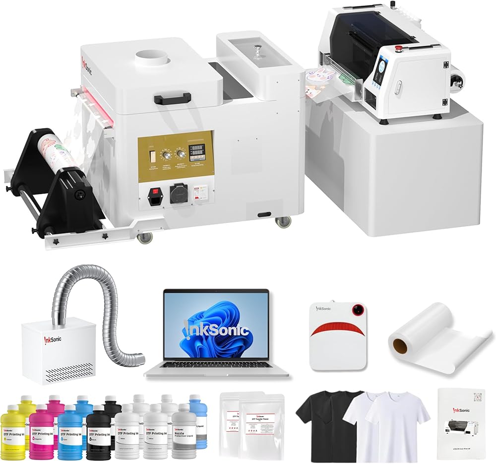 طابعة InkSonic Dual XP600 DTF، آلة طابعة XP600 DTF برأسين مع شاكر مسحوق ومجفف، طابعة ملابس A3 مع جهاز تنقية الهواء والكمبيوتر المحمول، الصيانة والمعالجة التلقائية، مباشرة إلى الفيلم