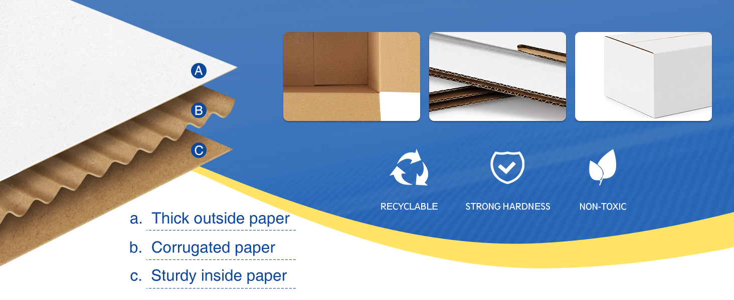 • متانة معززة: مصنوعة من الورق المقوى المموج، صناديق التعبئة هذه خفيفة الوزن ولكنها متينة وأقوى، مما يوفر قدرة تحمل فائقة ومقاومة للسحق لحماية أغراضك جيدًا أثناء النقل