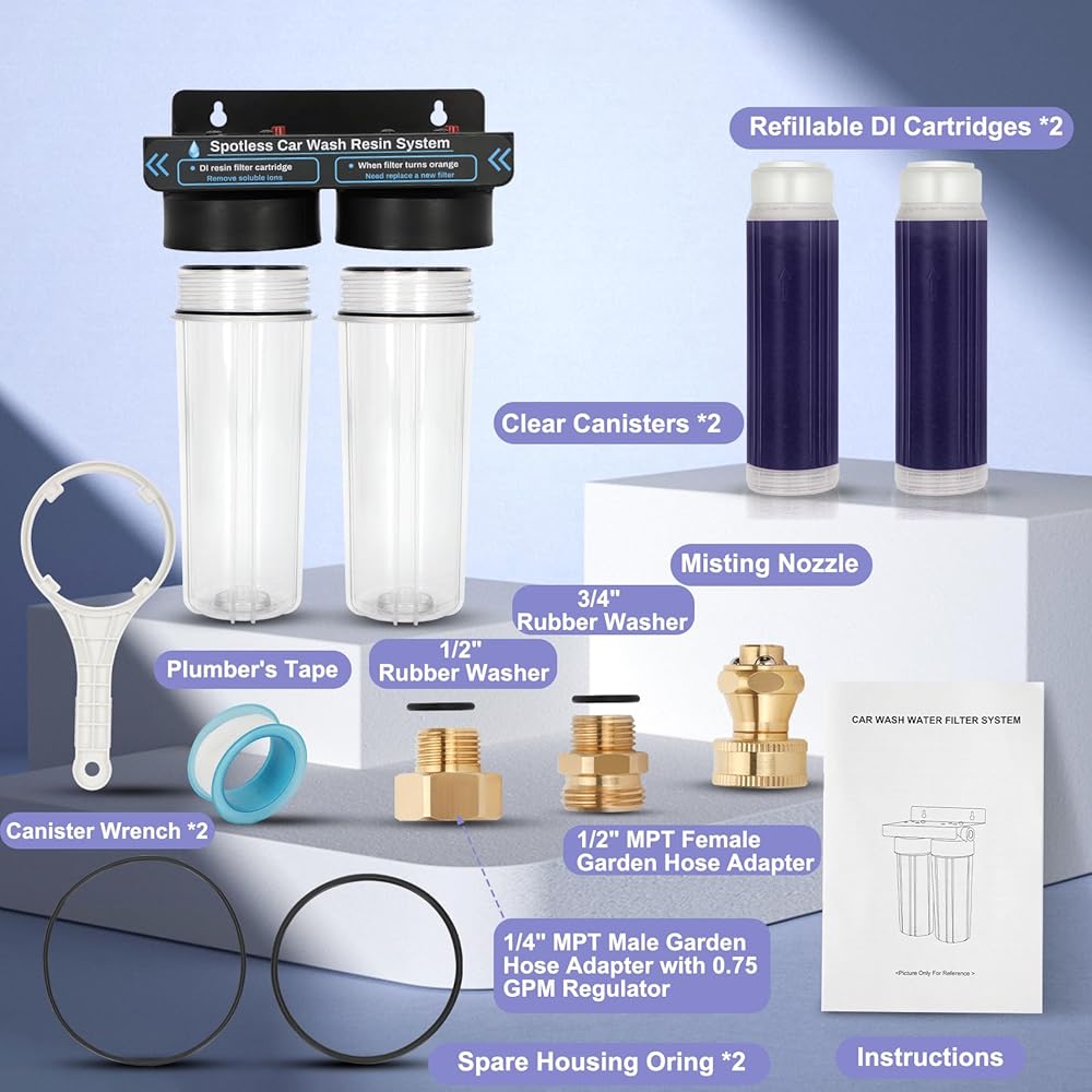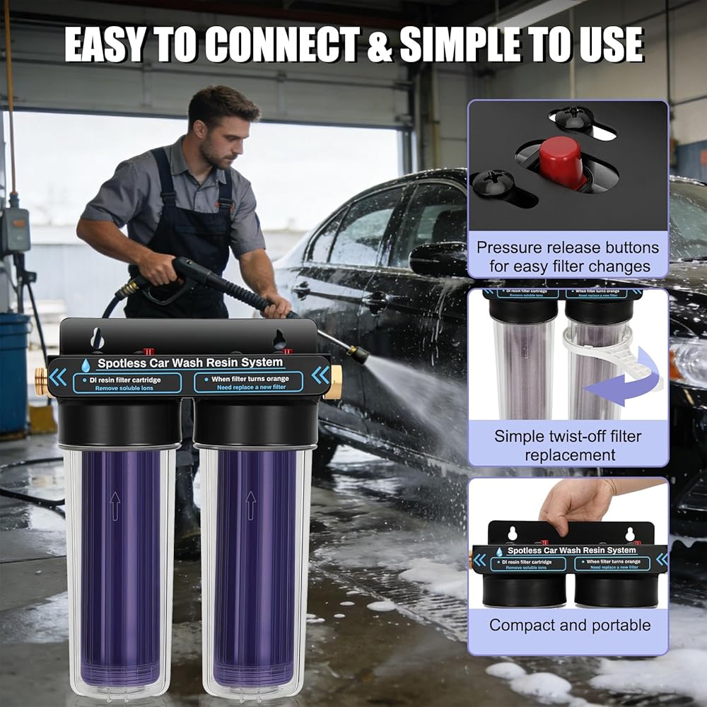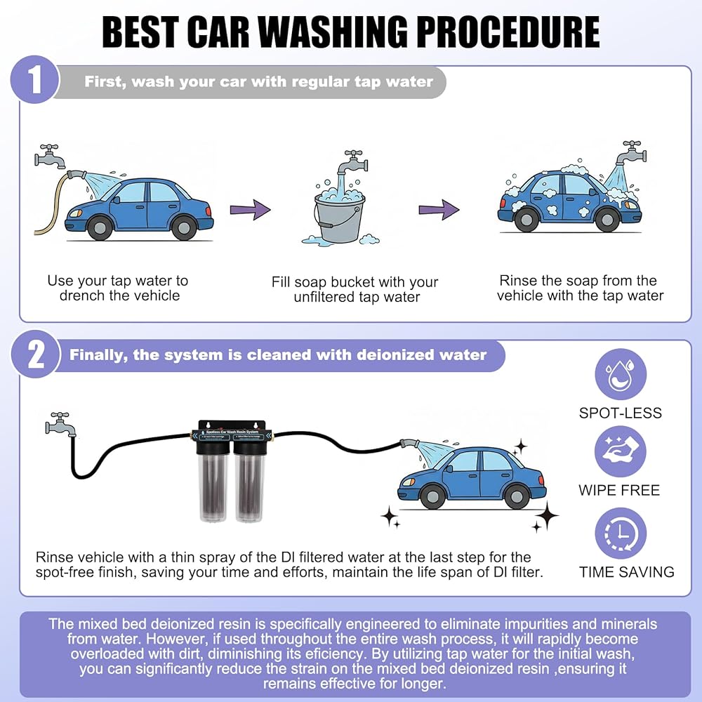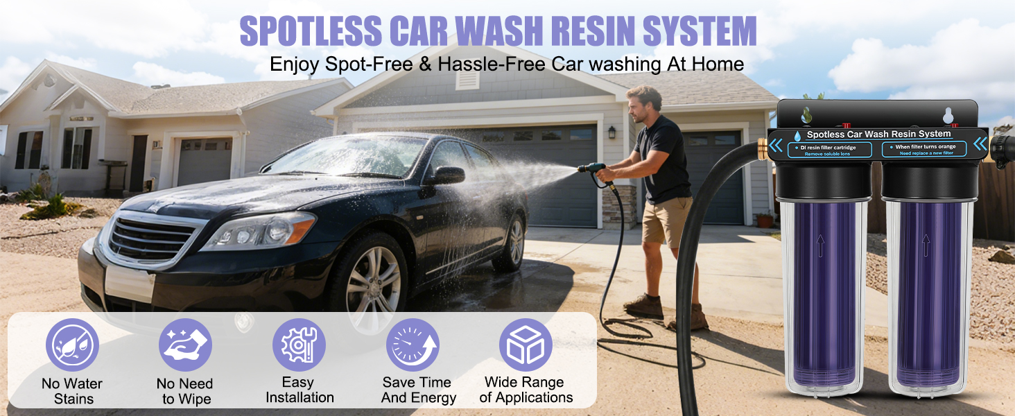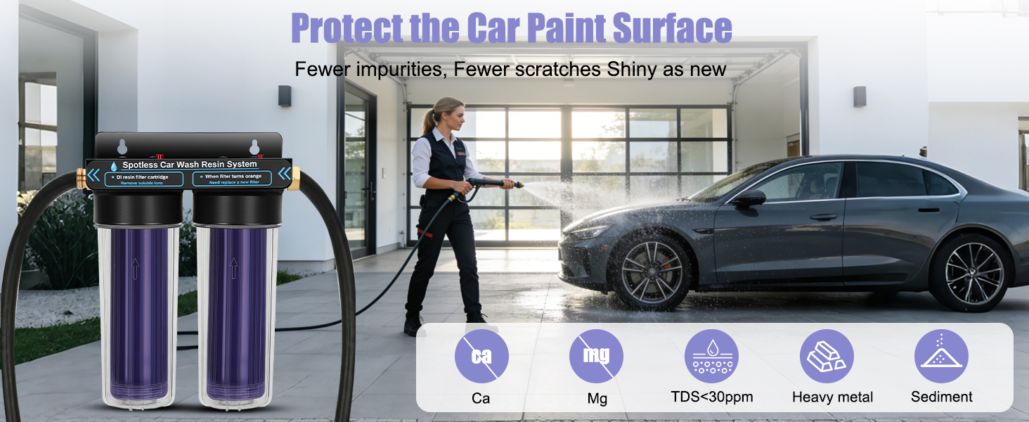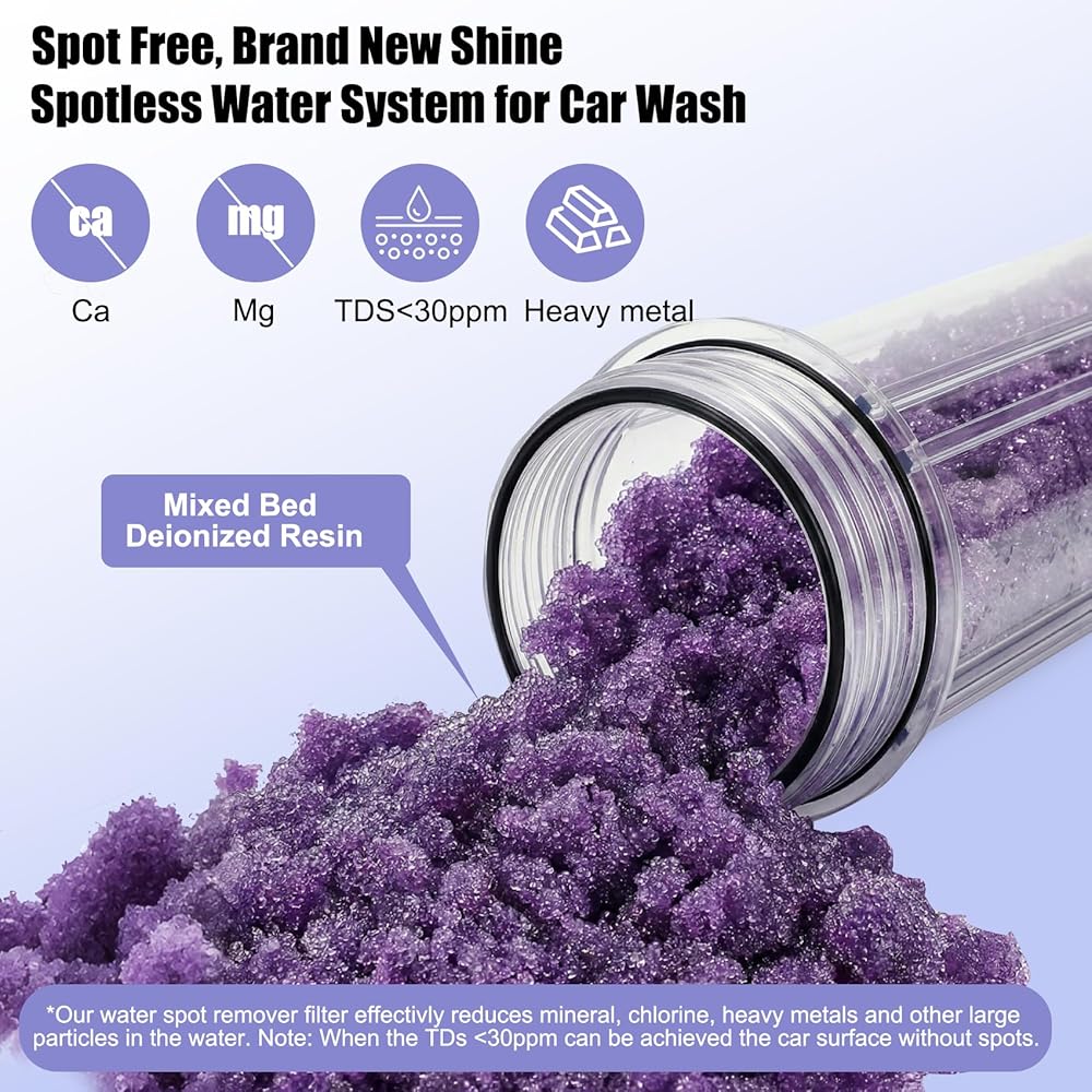 يقوم مرشح الراتنج المتين بإزالة TDS (إجمالي المواد الصلبة الذائبة) من الماء بشكل فعال: مثل أيونات الكالسيوم والمغنيسيوم المعدنية. ويساعد ذلك على تقليل الخدوش على طلاء السيارة ويتيح تنظيفًا خاليًا من البقع. يمكن لكل خرطوشة فلتر معالجة ما يقرب من 1800 إلى 2000 وحدة من TDS قبل الحاجة إلى الاستبدال. بمجرد استنفاد الراتينج، ما عليك سوى استبدال الخرطوشة للحفاظ على أداء الترشيح الأمثل