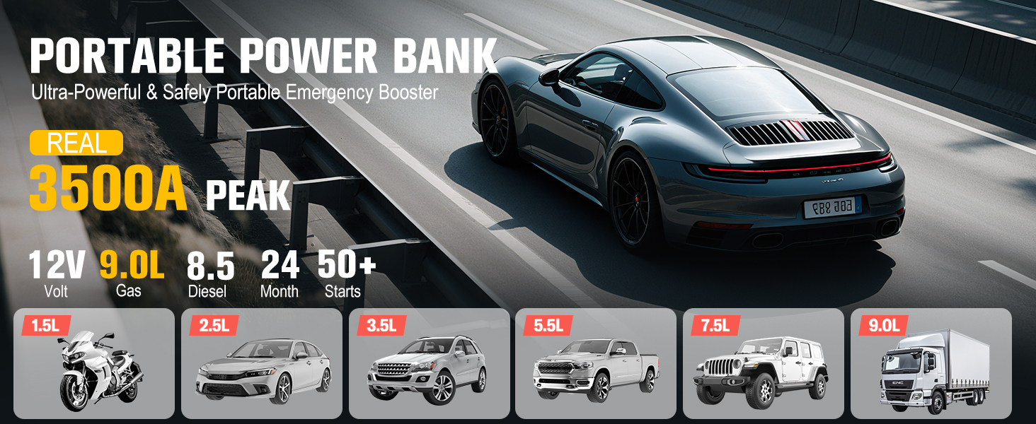 • جهاز تشغيل السيارة الكل في واحد - جهاز تشغيل السيارة المحمول VTOMAN X3 المزود بضاغط هواء يجمع بين بدء التشغيل السريع وتضخم الإطارات وإضاءة LED وإنذار SOS وشحن USB للهواتف الذكية والأجهزة اللوحية والأجهزة الأخرى. تُعد حزمة بطارية Jump Starter X3 بمثابة رفيقك المثالي في الرحلات البرية والطوارئ