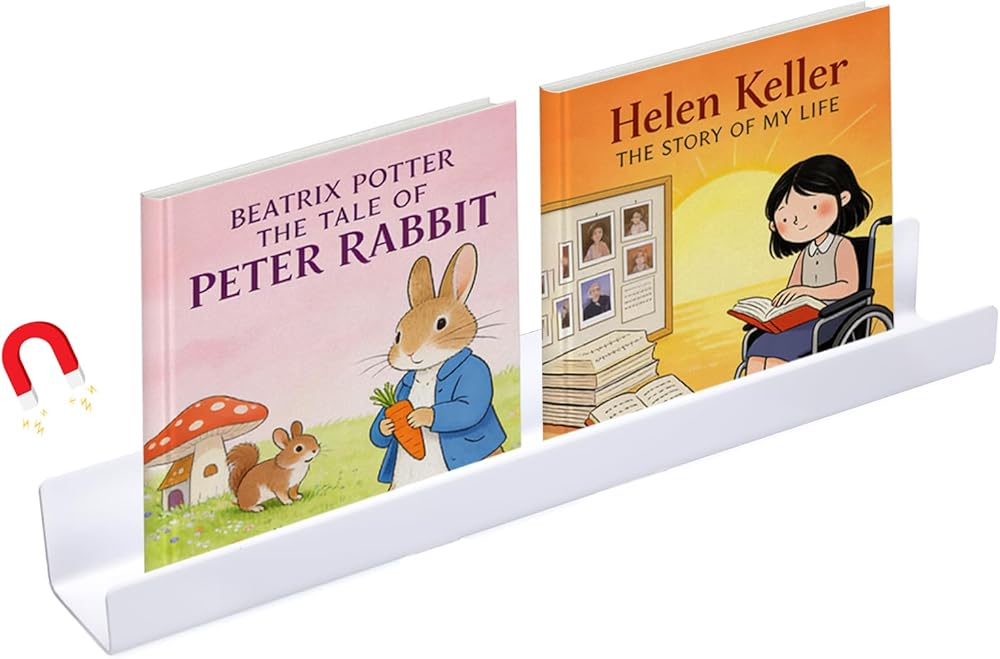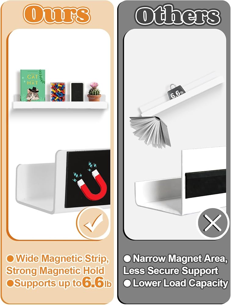 Strong Magnetic Hold: Built with a widened 2mm thick magnetic strip, this magnetic book shelf supports up to 6.6 lb and attaches securely without slipping. No drilling or damage required—simply place it on whiteboards, metal cabinets, or refrigerators