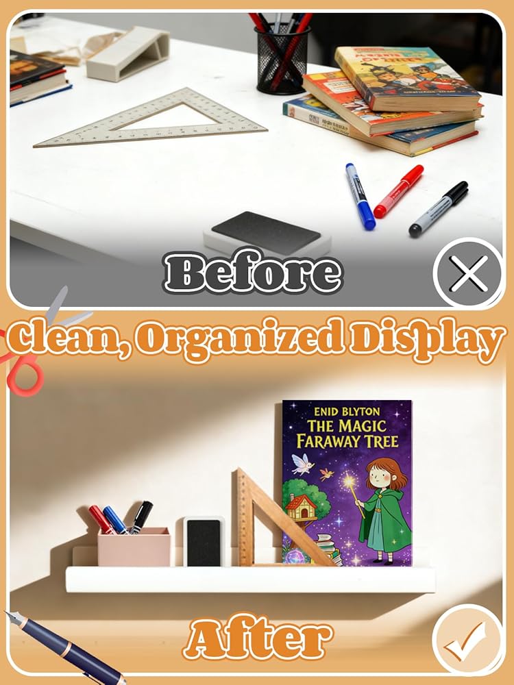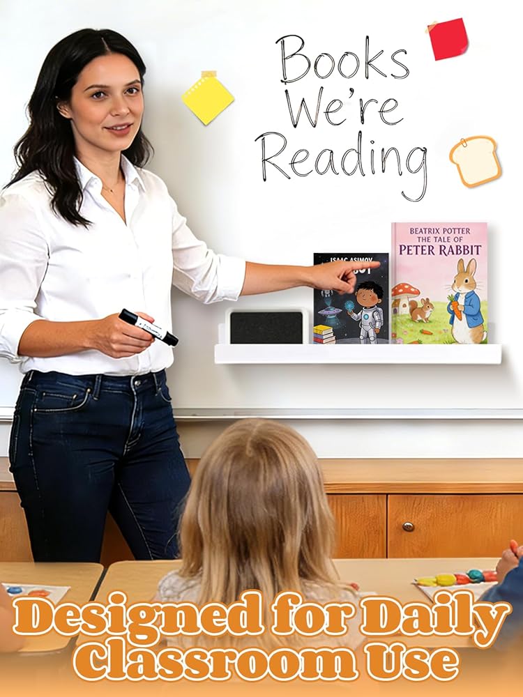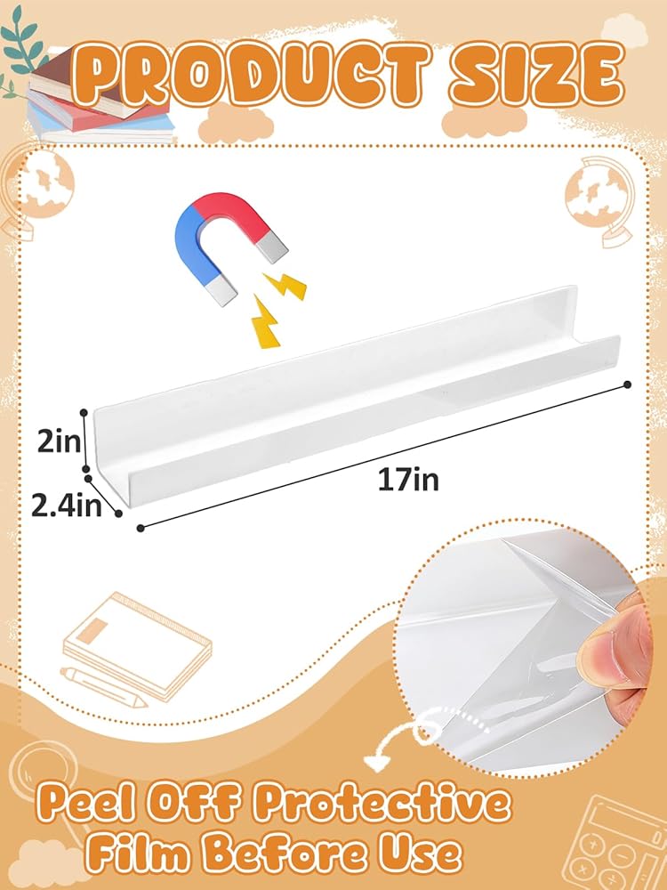 Functional Storage: The integrated shelf measures about 17 x 2.4 x 2 inches, displaying books easily. Ideal as an acrylic book holder for textbooks, picture books, magazines, rulers, and board erasers—perfect for organized classroom display and quick book changes