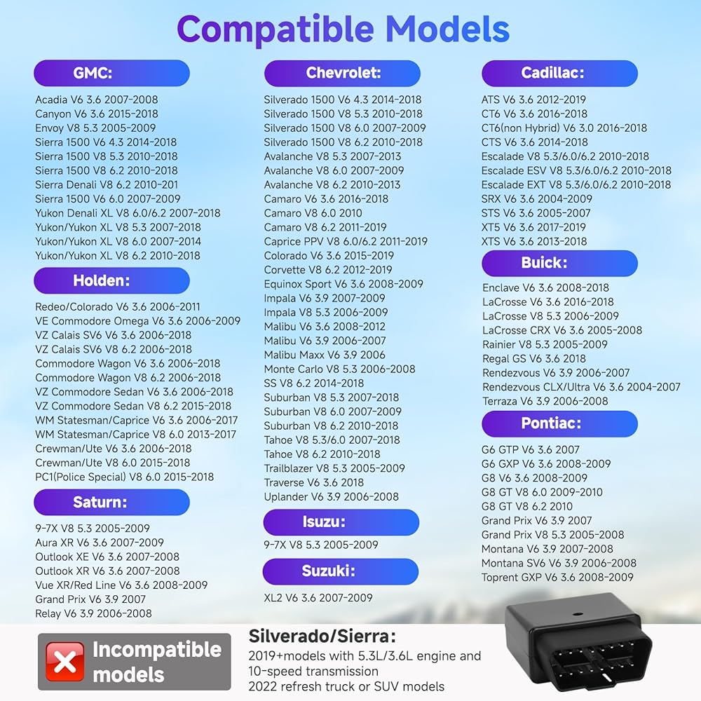GUARANTEED COMPATIBILITY: This AFM disabler 5.3 Silverado is compatible with most GM V6 and V8 engines, including Chevrolet, GMC, Cadillac, Buick, Holden, Pontiac, Saturn, Isuzu, and Suzuki; note it is incompatible with 2019+ Silverado/Sierra models with 5.3L/3.6L engine and 10-speed transmission or 2022 refresh truck/SUV models