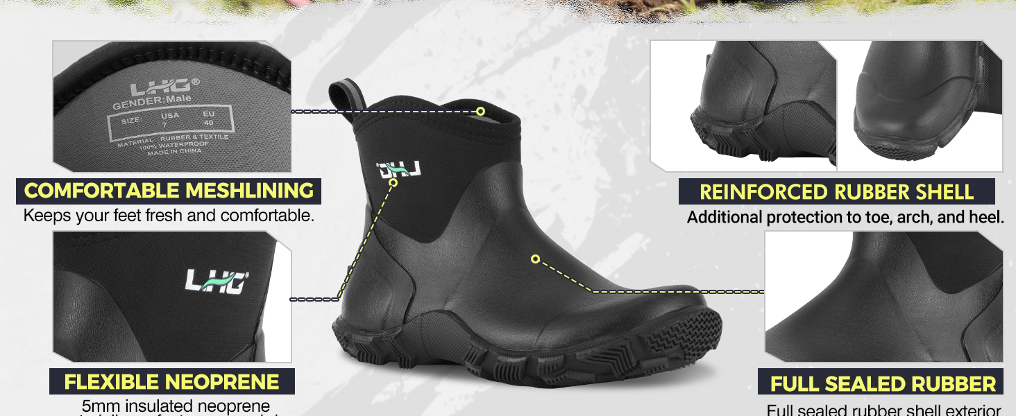 【مريحة】تتميز أحذية LHG المطاطية بنعل منحني على شكل محيط القوس الطبيعي لقدمك، مما يوفر الدعم الأساسي طوال اليوم. بالإضافة إلى خصائص امتصاص الصدمات والتصميم خفيف الوزن، فهي تضمن خطوات ثابتة وواثقة دون الشعور بالثقل