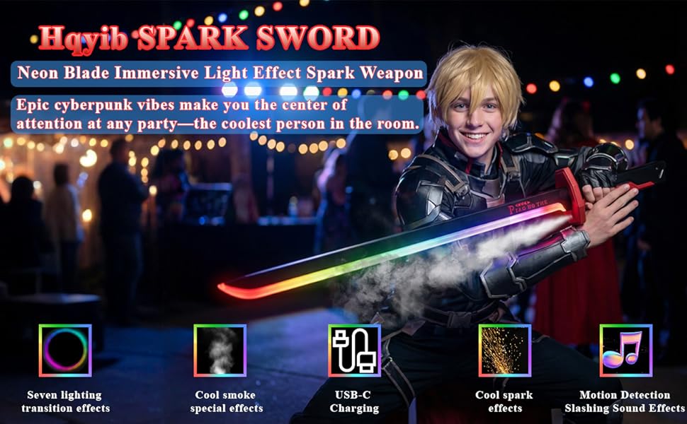 • 【سيف شرارة LED مع تأثيرات الضباب/الدخان】قم بتحريك سيف الشرارة لتنشيط مصابيح LED المبهرة، والشرر، والومضات السينمائية. إلى جانب المؤثرات الصوتية والأنظمة السمعية والبصرية المستشعرة للحركة، فإنها تخلق جوًا غامرًا من السايبربانك.