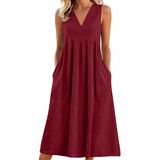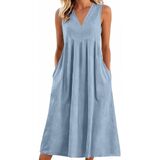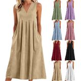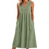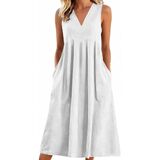 فساتين الكتان للنساء 2026 الخامس الرقبة 3/4 كم فستان ماكسي مطوي فستان طويل فساتين الصيف زر مع جيوب in Kuwait