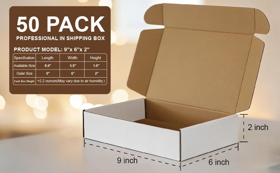 【الأبعاد】يوجد 50 صندوقًا على العبوة، بأحجام مثل 9 × 6 × 2 بوصة في نطاقات صغيرة إلى متوسطة. تعتبر صناديق البريد هذه مثالية لشحن التجارة الإلكترونية، أو تغليف المنتجات، أو تقديم الهدايا، أو التخزين الشخصي، أو عرض البيع بالتجزئة.
