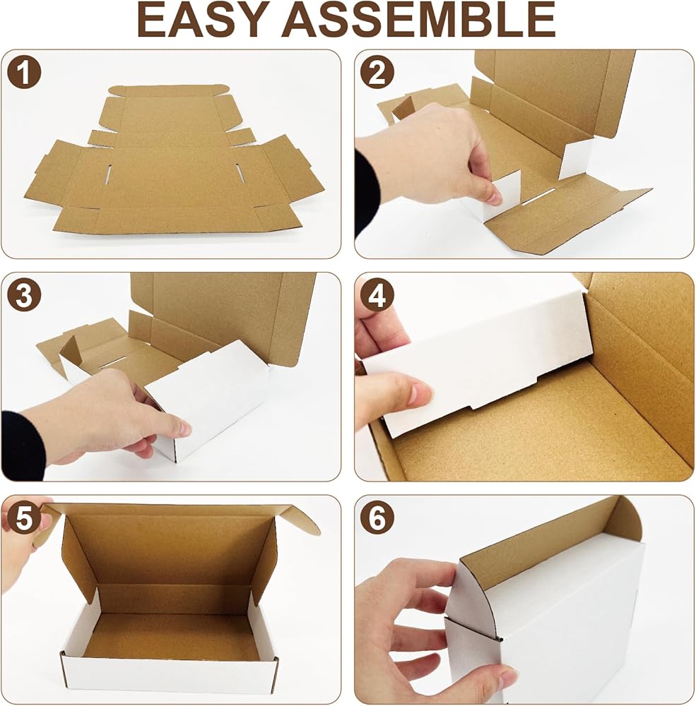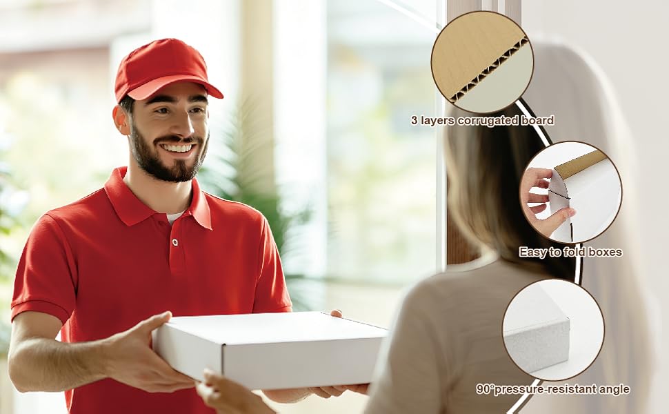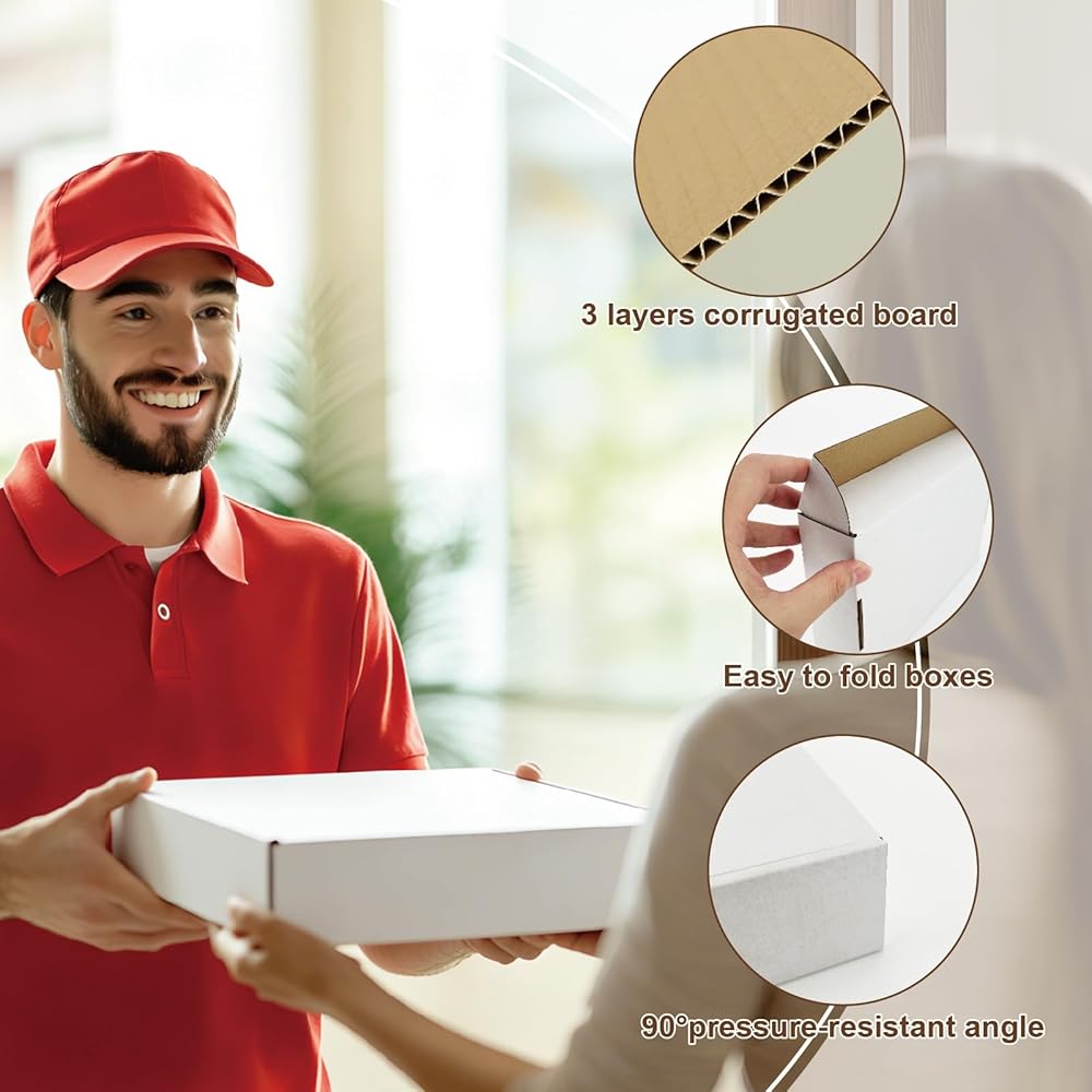 【سهل التجميع】يمكن تجميع صندوق الشحن الخاص بنا في ثوانٍ دون أي أشرطة أو غراء. يعزز المظهر الأبيض النقي والأنيق احترافية علامتك التجارية، مما يجعلها خيارًا ممتازًا للهدايا أو التغليف المتميز، ويمكن تخصيصها بسهولة باستخدام الملصقات أو الطوابع.
