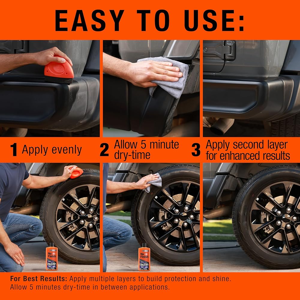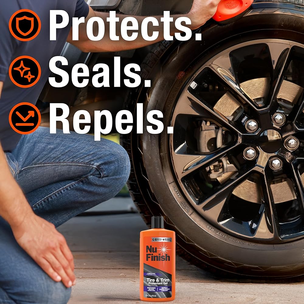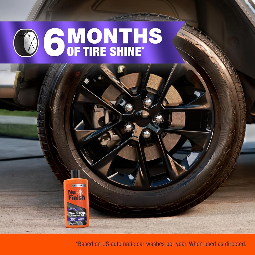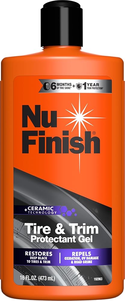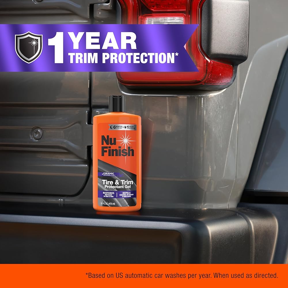 Enhance your vehicle's look and protection with the Nu Finish Tire & Trim Protectant Gel. This car exterior cleaner is designed to restore tire shine and trim shine, delivering a like-new finish that lasts for up to six months on tires and up to a year on trim.* Featuring Ceramic Technology, the advanced gel formula acts as both a tire protectant and car trim protectant, forming a hydrophobic barrier that repels water, UV rays, oxidation, and road grime. Also serving as a plastic restorer, this trim and tire gel delivers long-lasting, streak-free shine even after multiple washes.* Perfect for car owners, enthusiasts, and detailers alike, this patent-pending gel formula allows you to layer coats for customizable shine and longer-lasting defense on tires, textured plastic trim, weatherstripping, and exterior rubber. Layer the gel for customized protection and enhanced results. Trusted for car cleaning, car care, and car protectant needs, Nu Finish car cleaning supplies help keep your vehicle looking its best drive after drive. *Based on US Automatic Car Washes per year. When used as directed.