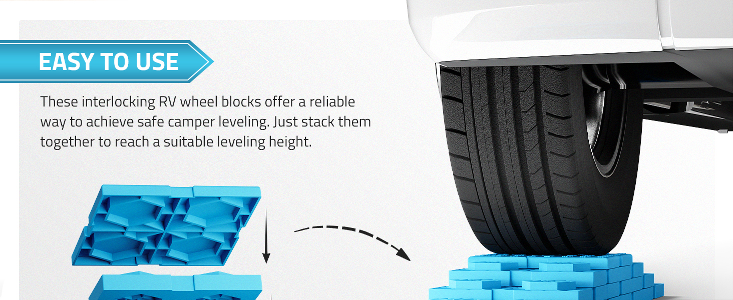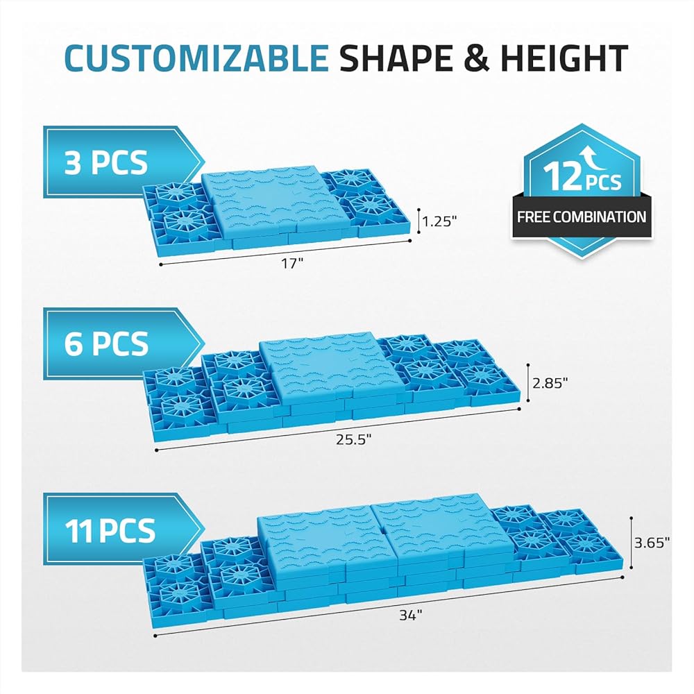 ارتفاع مستوى قابل للتخصيص: توفر كتل التسوية PAULINN RV حلاً قابلاً للتخصيص لتسوية RV الخاص بك. ما عليك سوى وضعها في شكل هرمي إلى الارتفاع المطلوب الذي تحتاج العربة الترفيهية إلى رفعه وقيادته على المكدس. تضيف كل كتلة 1.25 بوصة من الارتفاع الإضافي، كما أن إضافة كتلة تسوية إضافية إلى المكدس يزيد الارتفاع بمقدار 0.8 بوصة ويمكن تكديسها بأشكال وارتفاعات مختلفة لتناسب احتياجاتك.